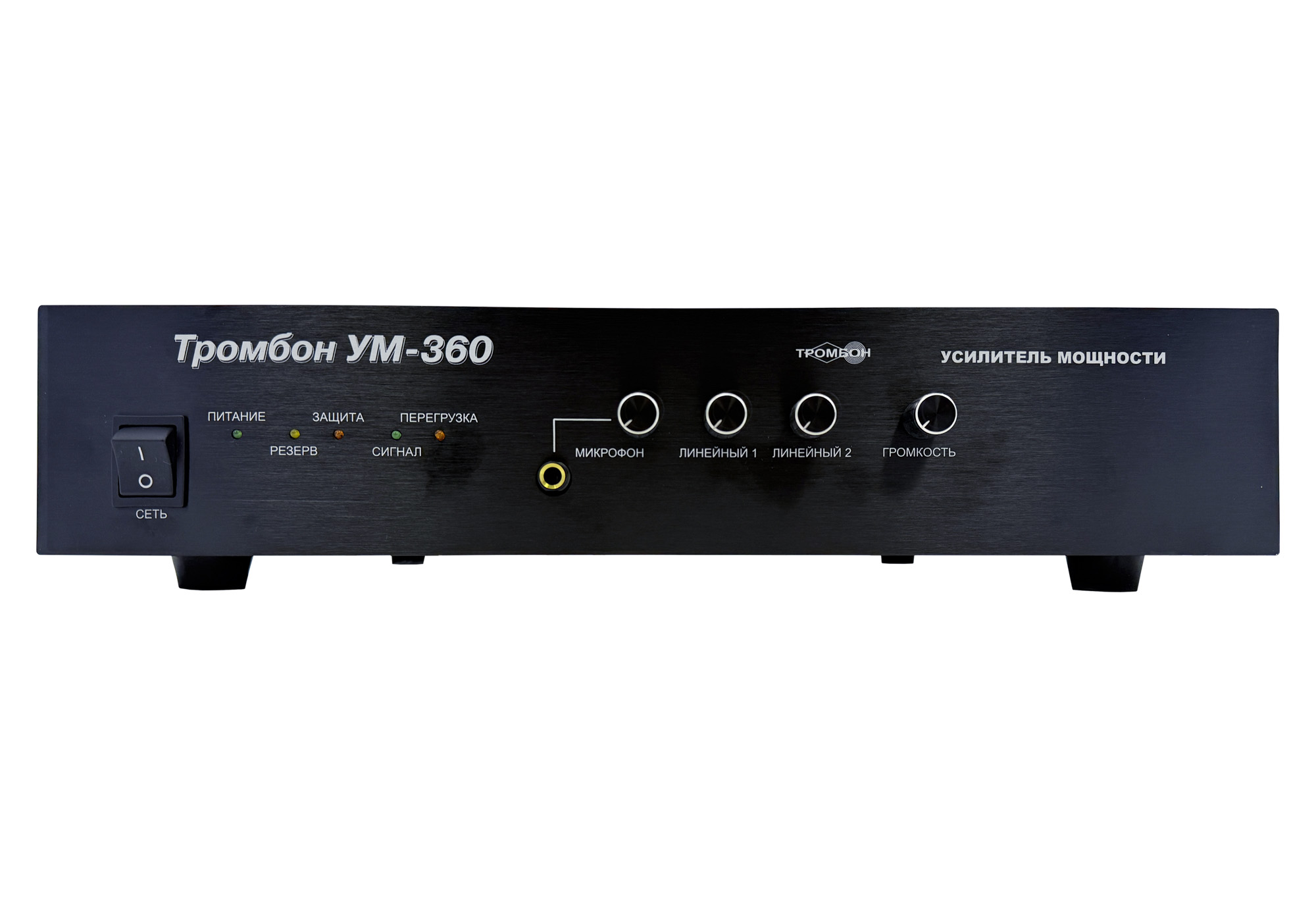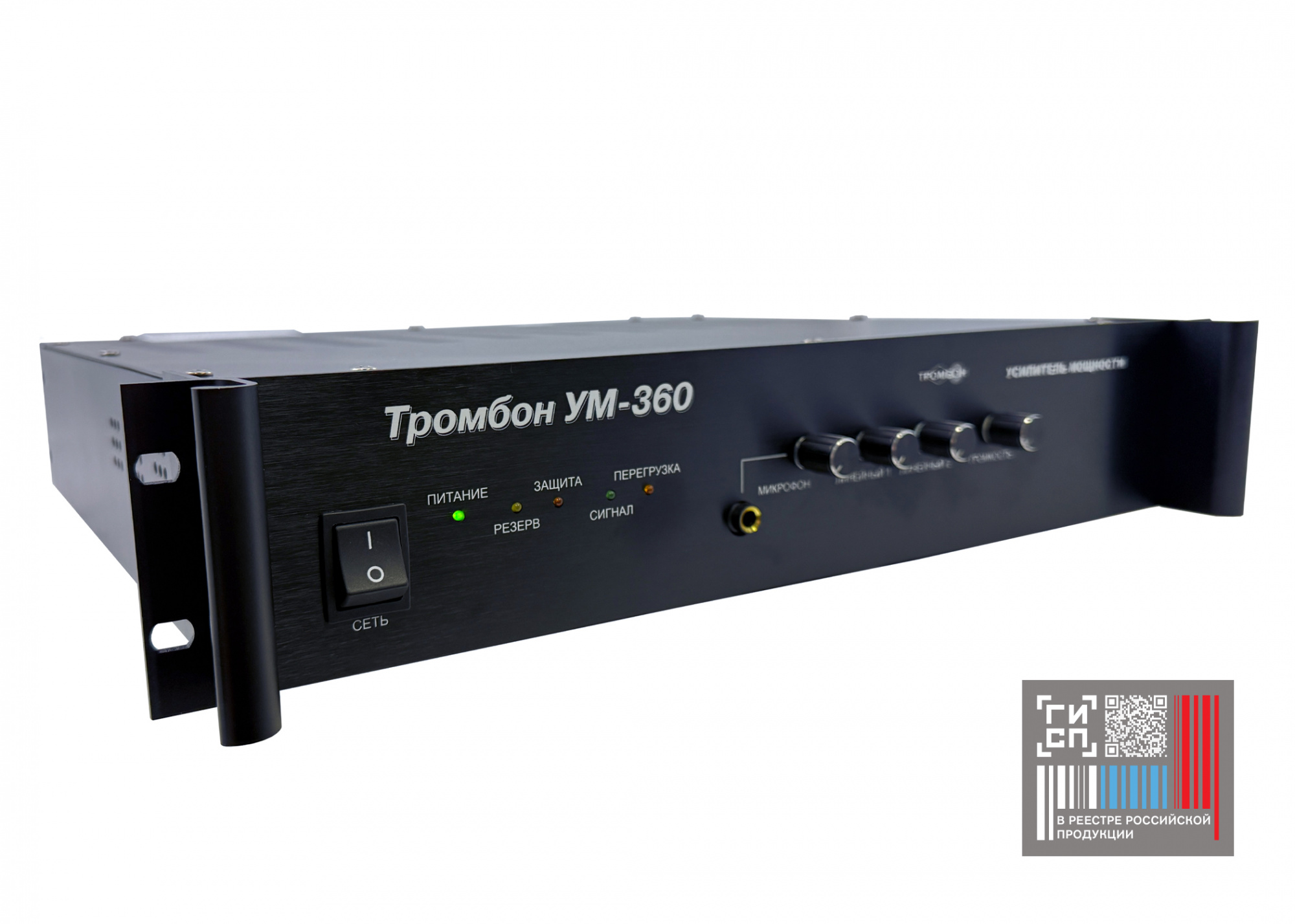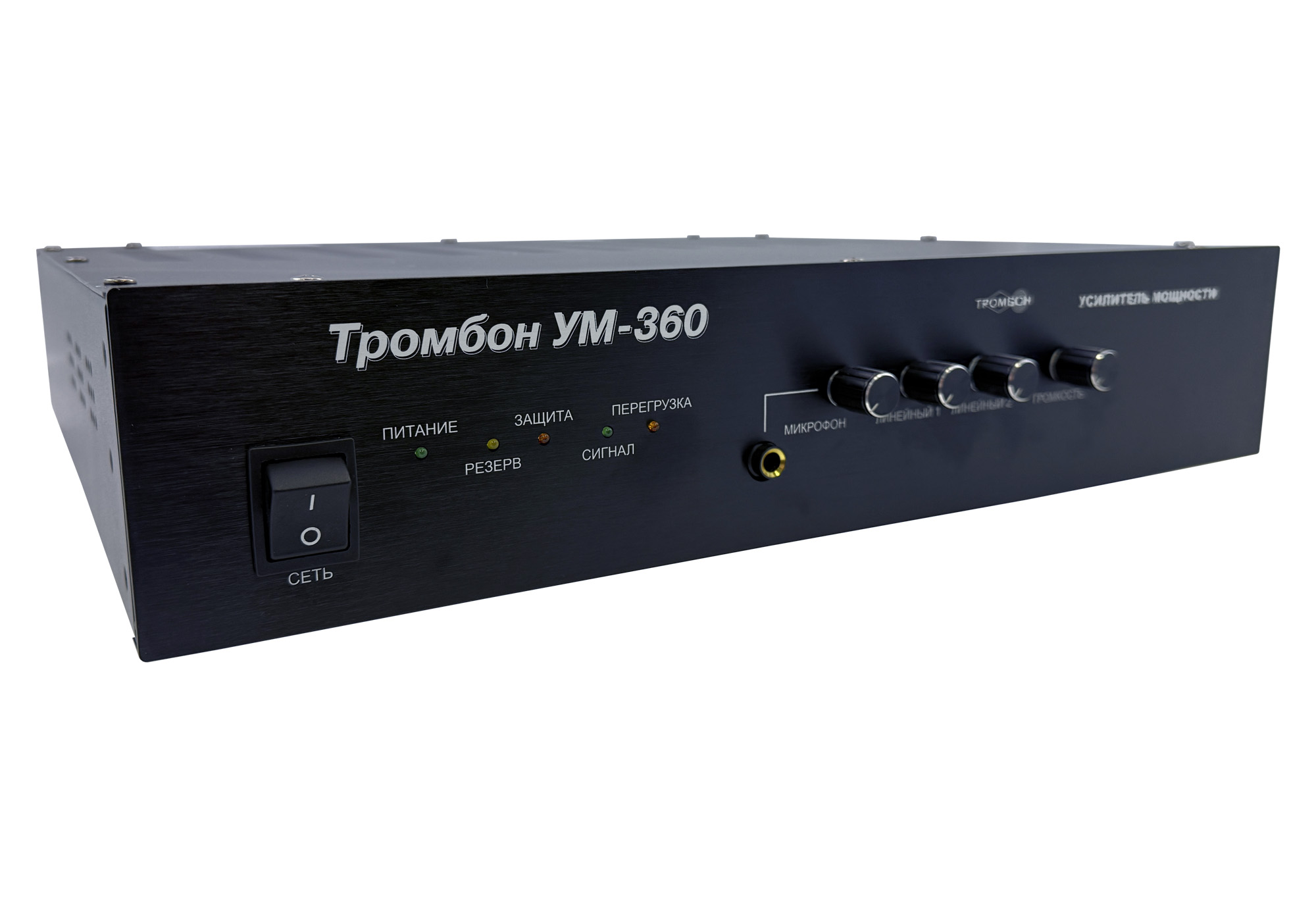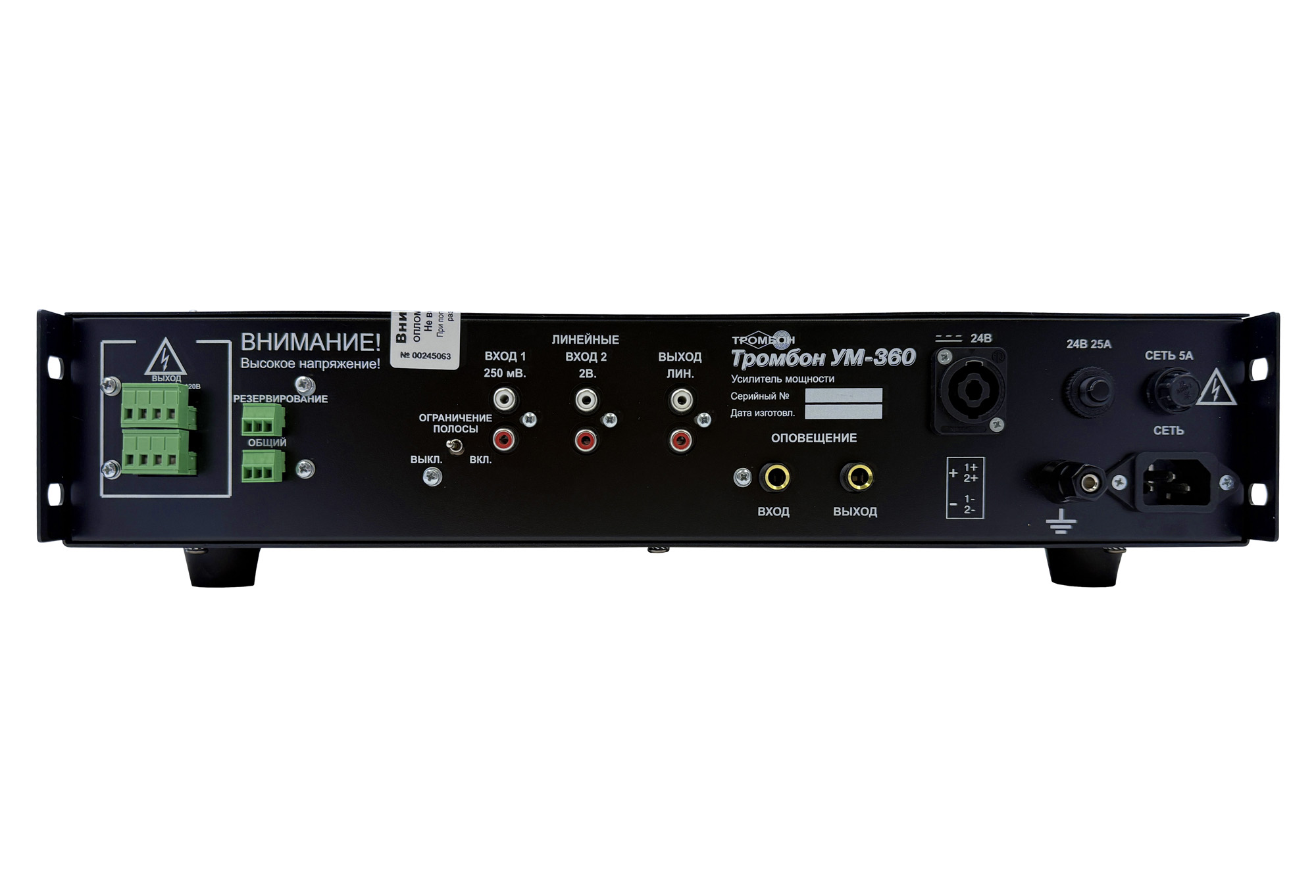 Высокоэффективный импульсный усилитель мощности "Тромбон УМ-360". Прибор предназначен для использования в составе систем оповещения людей о пожаре в зданиях и сооружениях.Преимущества: - Четыре входа: «Линейный вход 1», «Линейный вход 2», «Оповещение», «Микрофон» - «Выход оповещения» для каскадного соединения усилителей в системе оповещения - Регулировка уровня по всем входам (кроме входа «Оповещение») - Высокая энергетическая эффективность - Улучшенное звучание - Малые габариты - Облегченная конструкция - Возможность резервирования усилителей мощности