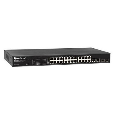 IP-коммутатор. 24 порта 10/100 Base-TX + 4 порта Gigabit Uplink (TP x 2, SFP x 2). Поддержка MDI/MDX-X. Стандарт PoE IEEE 802.3at PoE. До 30W на порт. Управление через WEB интерфейс. Протоколы VLAN, QoS, RSTP, IGMP, LACP, Port Security, BContr., BSC. Максимальная суммарная нагрузка 400 W. Металлический корпус. Типоразмер 19”.