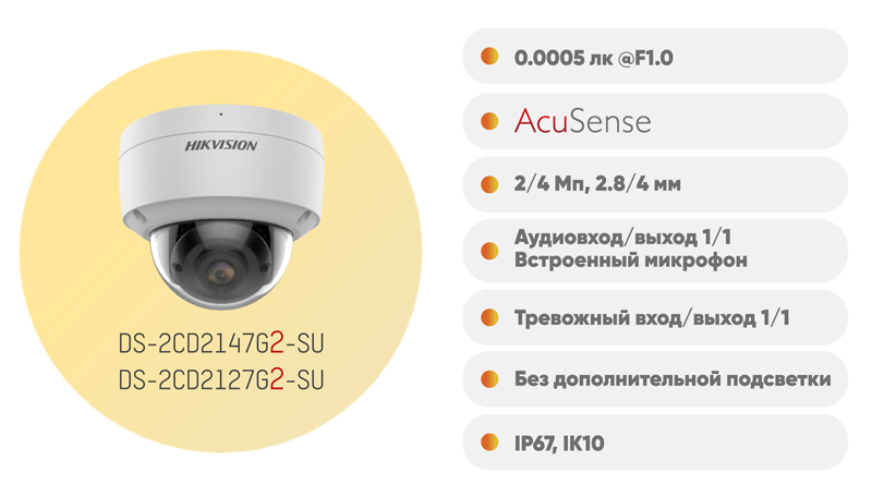 В линейке сетевых камер ColorVu впервые появились камеры в корпусе «купол» – DS-2CD2127G2-SU и DS-2CD2147G2-SU. Новинки обладают высокой светочувствительностью (0.0005 лк), а также поддерживают работу с фирменной нейросетевой технологией компании Hikvision – AcuSense, что обеспечивает не только цветное изображение в режиме 24/7, но и эффективную фильтрацию ложных тревог и классификацию целей по типам «человек/транспортное средство».