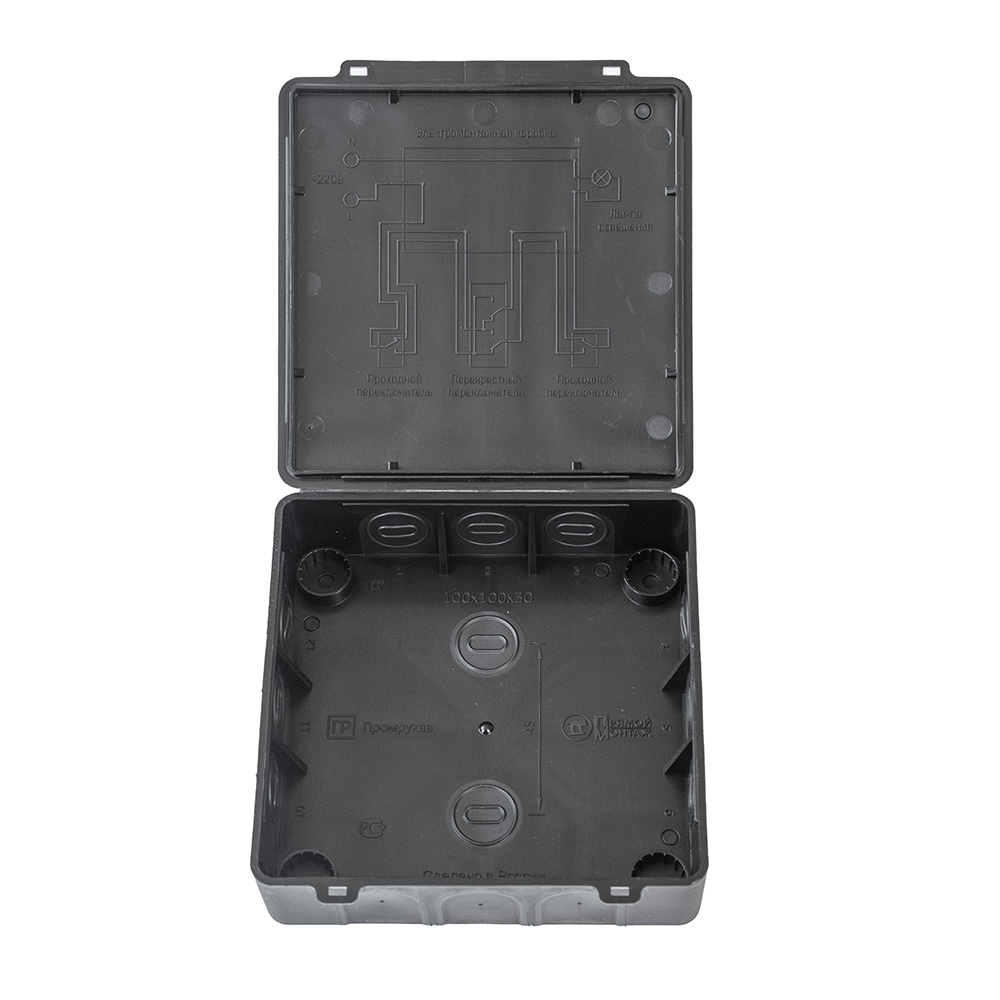 Коробка распределительная 60-0302-9005 для прямого монтажа двухкомпонентная безгалогенная (HF) чёрная 100х100х30 Промрукав