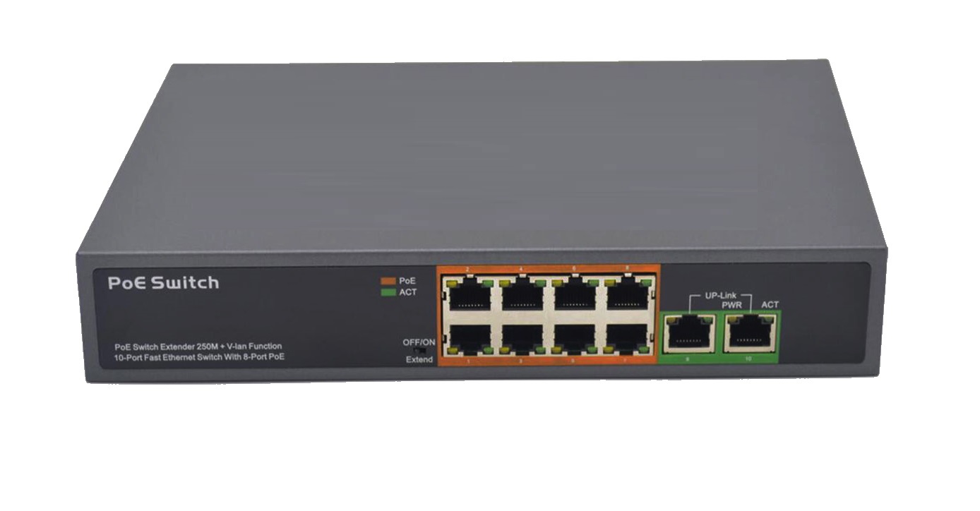8 портов RJ45@100Mbps+2Gbps IEEE 802.3af PoE,15W@порт, 48-57VDC@2,5A, t=0°С~+55°С,207x95x27мм,1,3кг