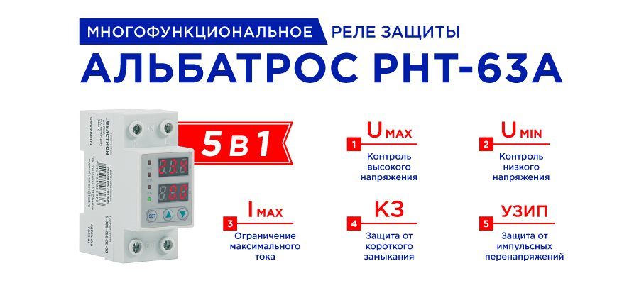 Реле напряжения АЛЬБАТРОС РНТ-63А предназначено для защиты нагрузки от скачков и провалов напряжения и от перегрузки по току путем отключения нагрузки. Изделие имеет функцию автоматического восстановления после срабатывания.