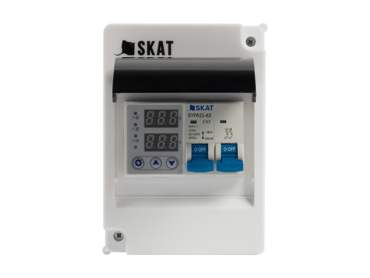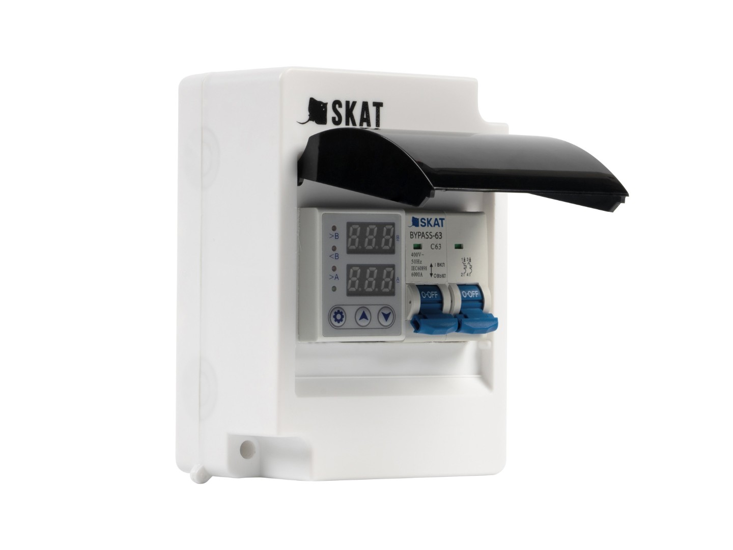 Изделие SKAT ST BYPASS 220/63А RV предназначен для ручного переключения (байпаса) между линией, защищенной стабилизатором, и линией, защищенной реле напряжения от высокого, низкого напряжения и от превышения тока.