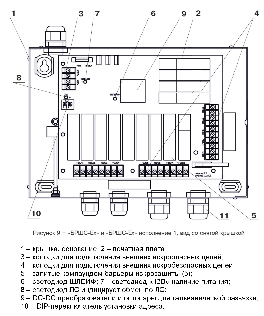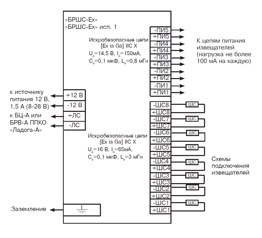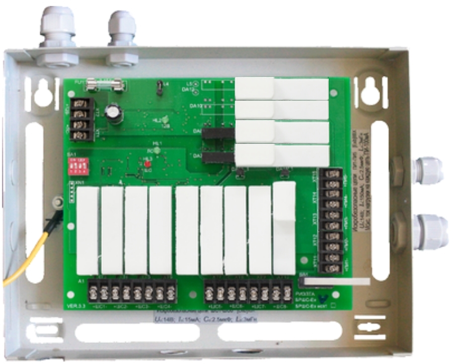 Блок расширения шлейфов сигнализации, контролирует 8 искробезопасных шлейфов, 5 искробезопасных цепей питания по 100 мА, маркировка [Exib]IIВХ. Интерфейс связи с БЦП - RS-485, встроенный протокол R08