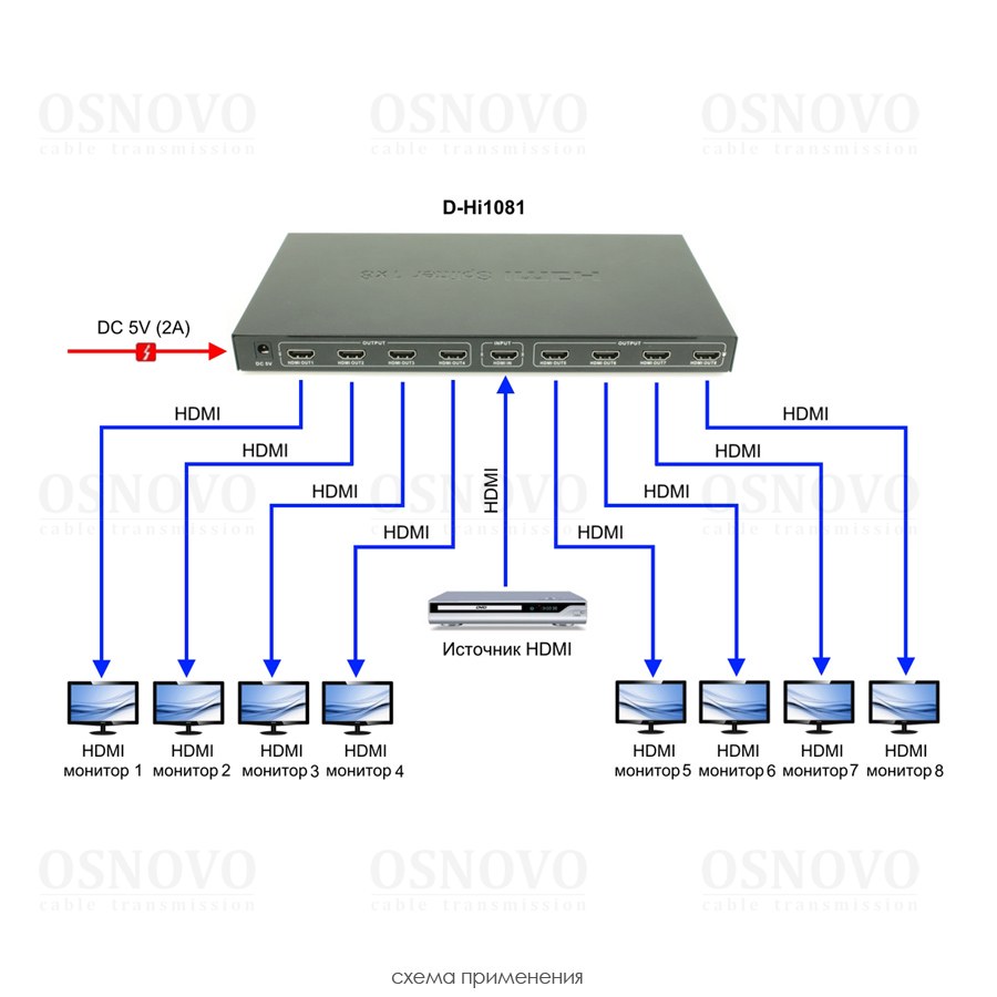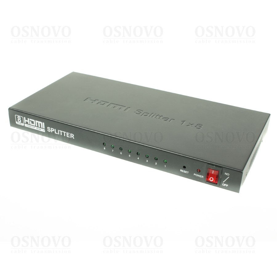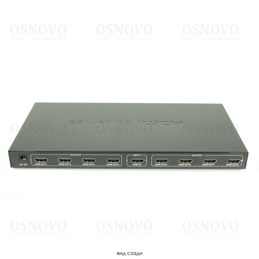 Разветвитель сигнала HDMI (1вх./8вых.). Максимальное разрешение 4K2K(30Гц). Поддержка 3D и HDCP. Скорость передачи данных до 10,2Гбит/с.Вх.- HDMI(A)/Роз.2,1х5мм(DC5V). Вых.- HDMI(A)x8. В комплекте БП DC5V(2А). Вес: 0,7кг. Размеры (ШxВxГ): 277x26x140мм. Рабочая температура -5…+55°С.