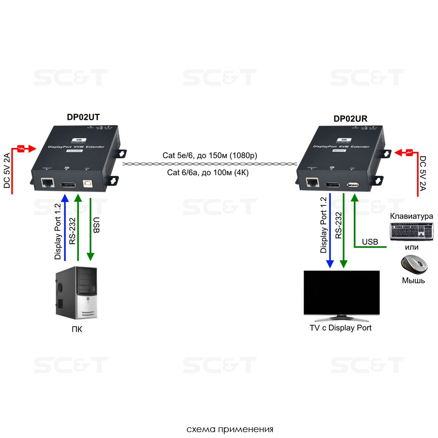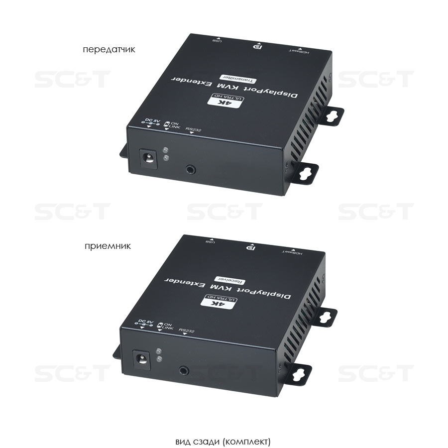 Комплект (передатчик + приёмник) для передачи DisplayPort + USB + RS232 по одному кабелю витой пары CAT5e(HDBaseT) до 150м(1080px60Гц(8бит), CAT6 до 100м(4096х2160х60Гц(4:2:0) или 4096х2160х30Гц(4:4:4). Поддерживает DP 1.2a и HDCP. Передача аудио: LPCM 7.1 @ 192кГц, Dolby TrueHD, DTS-HD MA. Возможность обновления прошивки. Передатчик: вх. - DisplayPort/DB9(f)(RS232)/USB(B)/DC5V, вых. - RJ45. Приёмник: вх. - RJ45/DB9(m)(RS232)/USB(A)/DC5V, вых. - DisplayPort. В комплекте БП AC 220V/ DC5V(2A) - 2шт. Размеры каждого устройства (ШxВxГ): 109,6x30x109,4мм. Рабочая температура -10…+45гр.С.