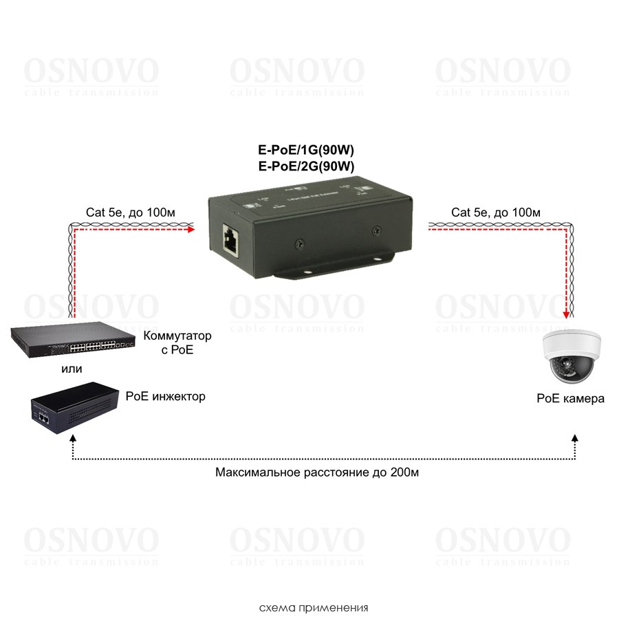 PoE удлинитель 10M/100M/1000M Gigabit Ethernet до 700 метров со встроенной грозозащитой 6кВ. (потребуется 6 устройств). 70 Ватт на дистанции 100 метров, 3,8 Ватт на максимальной дистанции. Увеличение расстояния передачи данных + питание на 100м. Соответствует стандартам PoE IEEE 802.3af/at/bt. Автоматическое определение PoE устройств. Входная мощность PoE до 90W. Питание: через порт Uplink (до 90W). Размеры (ШхВхГ): 51 x 28 x 90 мм. Рабочая температура: -10...+50 гр. С.