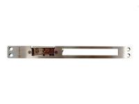 Потребляемый ток 1A, питание 12В (DC), режим работы: НЗ (открывается подачей питания),переставляемый язычок (до 5мм), переставляемая запорная планка, механическая разблокировка, арретир, сила удержания 400кг, материал: сталь с покрытием. Накладка в комплекте, размер защелки: 75х21х31мм, размер накладки: 250x25x3мм, вес: 270 гр, от -40 до +50 °С.
