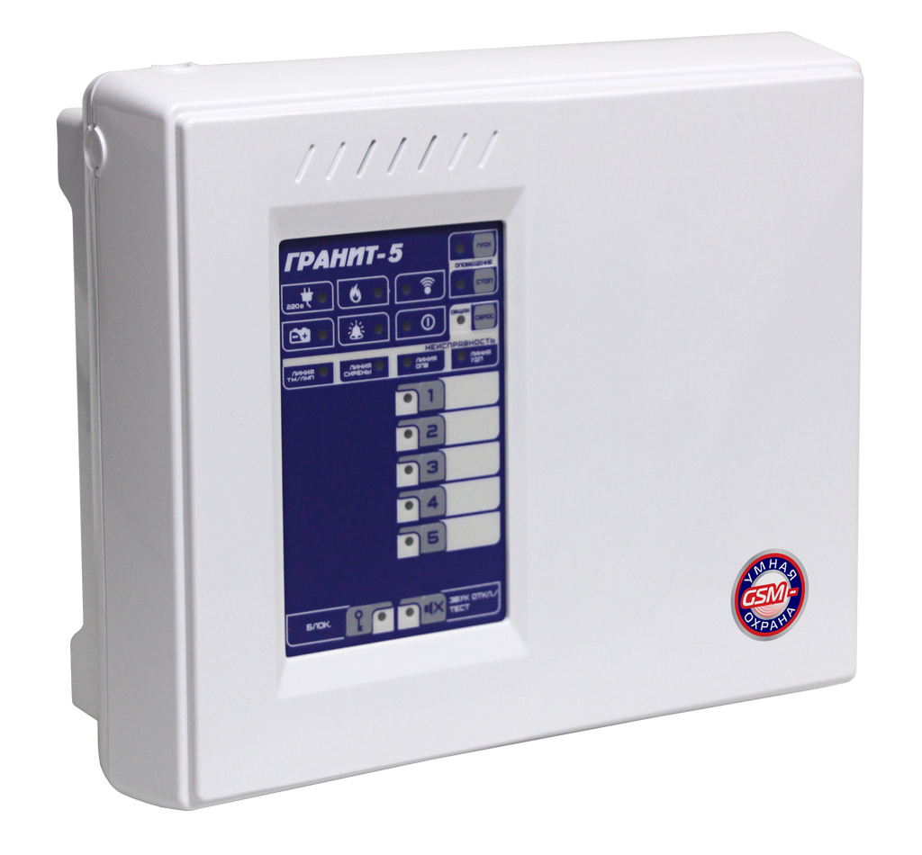 Прибор приемно-контрольный Гранит-5А, 5 зон, автодозвон, GSM-сигнализация (2 SIM-карты+ГТС), речевые сообщения, РИП, программирование через ПК (USB).