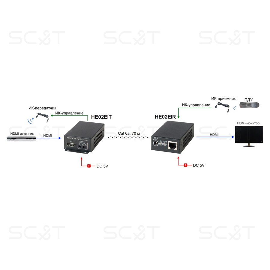 Комплект для передачи (удлинитель) HDMI сигнала с ИК повторителем по одному кабелю витой пары (HDBaseT). Поддержка версии 1.4a HDMI и HDCP. Расстояние передачи до 60 м (1080p, CAT5e/6), до 70 м (1080p, CAT6a). Поддержка разрешения до 4K(30Гц), 24бит, 3D и цифровых форматов аудио LPCM 7.1, Dolby TrueHD, DTS-HD MA. Передача ИК сигнала может осуществляться в прямом или обратном направлении. Передатчик: 1 вход HDMI тип А, 1 выход RJ-45, 1 ИК порт 3,5 мм. Приёмник: 1 выход HDMI тип А, 1 вход RJ-45, 1 ИК порт 3,5 мм. Максимальная скорость передачи данных 10,2 Гбит/сек. Питание каждого устройства 5VDC, 2A. Размеры каждого устройства (ШxВxГ): 49.2х25х92мм. Рабочая температура -40...+55°C.