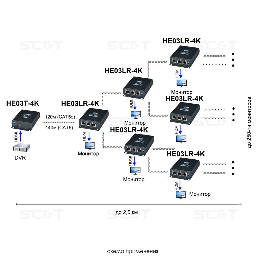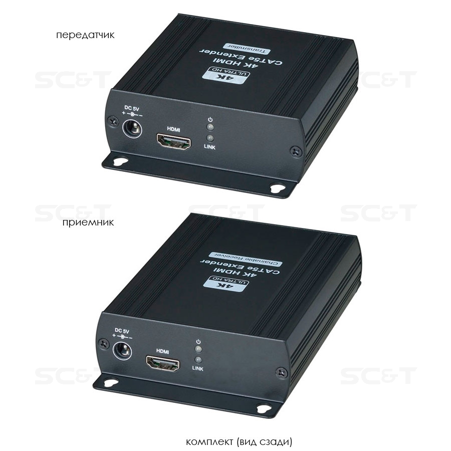 Комплект (передатчик + приёмник) для передачи HDMI сигнала по одному кабелю витой пары на расстояние до 120м(CAT5e), до 140м(CAT6) с возможностью каскадного подключения дополнительных приемников(до 250 мониторов, общая протяженность до 2,5км). Разрешение до 4K(30Гц), 4:4:4. Поддерживает HDMI v1.4, HDCP 1.4. Поддержка аудио: LPCM 7.1 @ 192кГц. Расстояние передачи можно увеличить при помощи удлинителя SR01 на 120м. Передача контента для цифровых вывесок (Digital Signage).Передатчик: Вх. - HDMI(A)/Роз.2,5х5мм(DC5V). Вых. - RJ45. Приёмник: Вх. - RJ45/Роз.2,5х5мм(DC5V). Вых. - HDMI(A)/RJ45x2. В комплекте БП DC5V(2А) - 2шт. Размеры передатчика (ШxВxГ): 88x30x110мм. Размеры приёмника (ШxВxГ): 88x30x145мм. Рабочая температура: -40...+55гр. С.