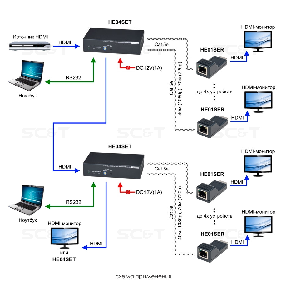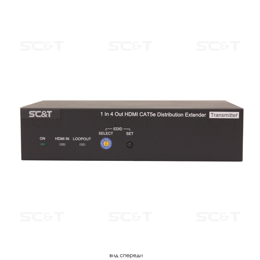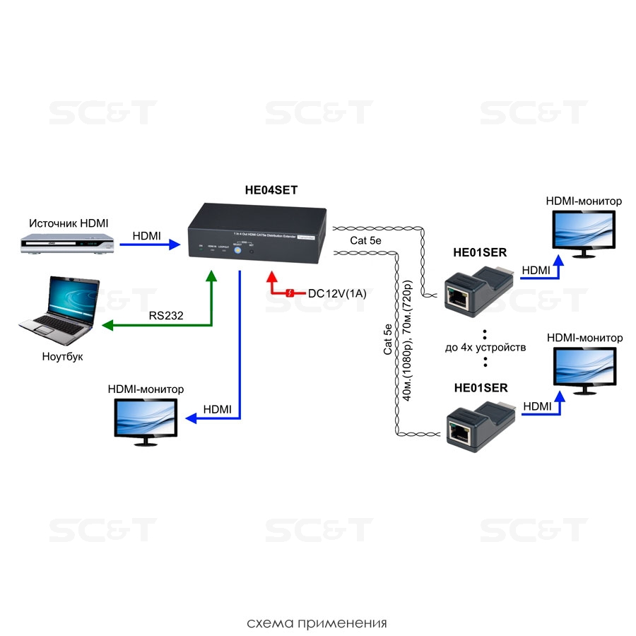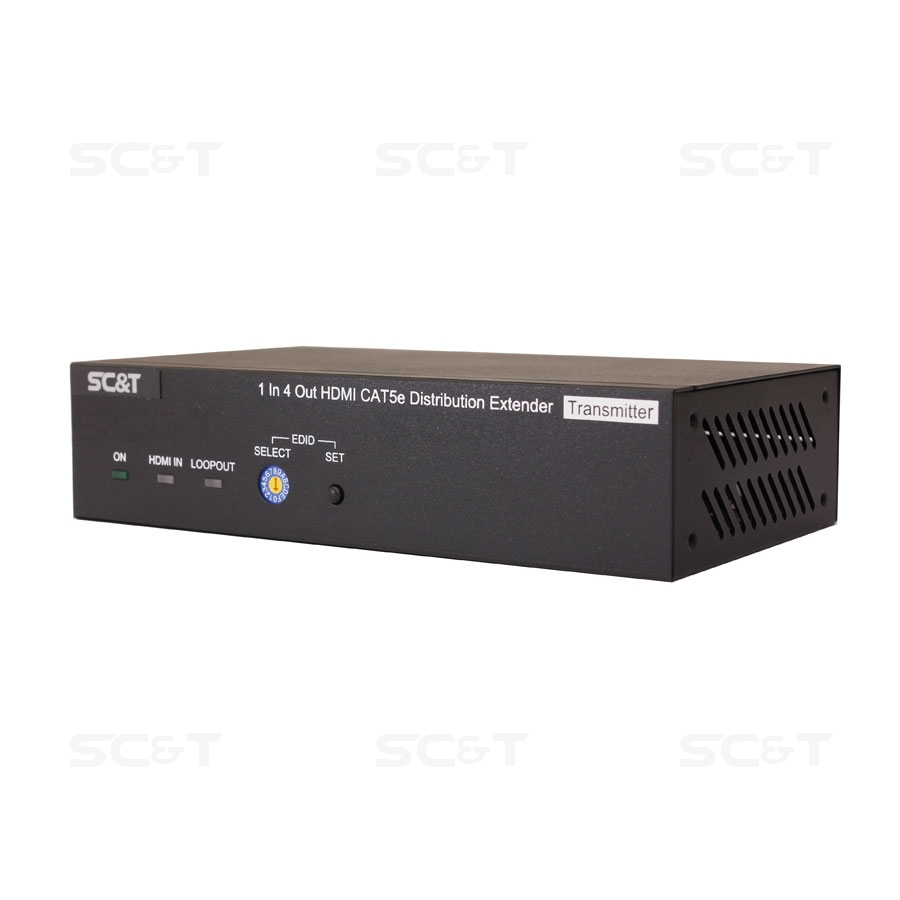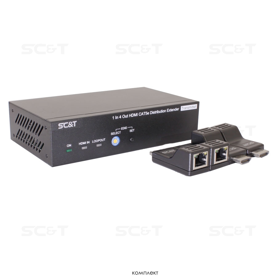Комплект (удлинитель-распределитель+4 приёмника) HDMI 1.4 (1 вход/4 выхода) с передачей по кабелю витой пары CAT5e на удалённые приёмники. Расстояние передачи до 40 м (1080p), до 70м (720p). Вх.-1xHDMI(тип А), 1xRS232, вых.-4х/4RJ45, 1xHDMI(тип А), 1xDC12В. В комплект входит удлинитель-распределитель HE04SET, 4 приёмника по витой паре HE01SER и БП DC12В(1A). Размер HE04SET (ШxВxГ): 167х40х101мм. Размер каждого приёмника по витой паре (ШxВxГ): 24х20,2х57,5мм. Рабочая температура 0...55°С.