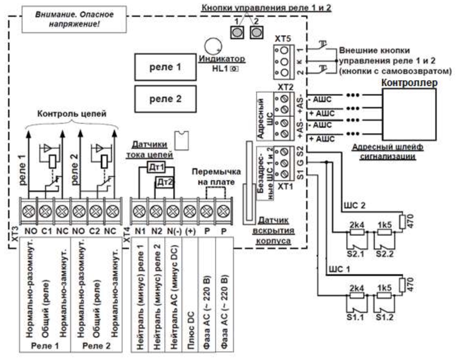 Адресный исполнительный модуль. 2 переключающих реле до 220В, 2А, могут применяться для управления двумя клапанами с приводами "Белимо". Контроль обрыва цепей нагрузки. Исполнение для эксплуатации на промышленных и специальных объектах
