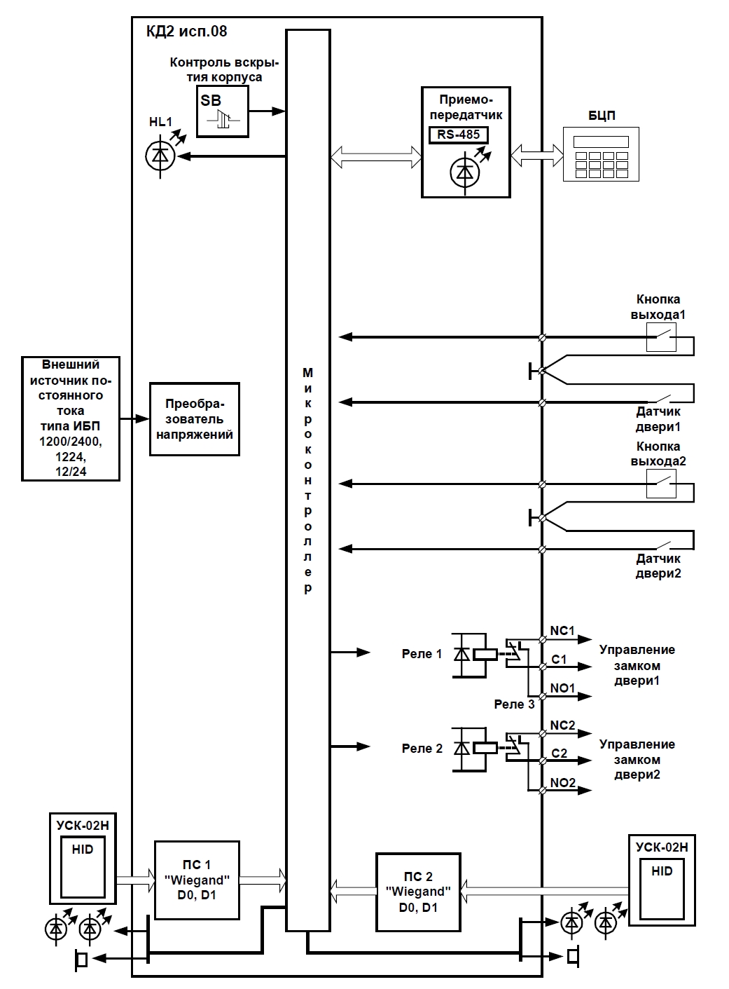 Сетевой контроллер устройств считывания кода обеспечивает подключение до 4-х считывателей по интерфейсу Wiegand, 2 реле управления, RS-485