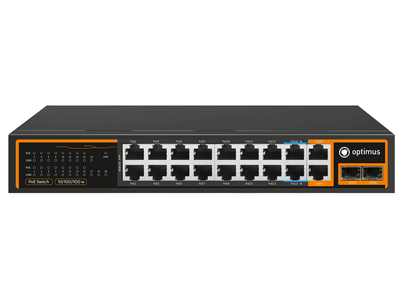 14 портов 10/100 Мбит/с RJ-45, PoE+ 2 порта 10/100 Мбит/с RJ-45, PoE++ 2 порта 10/100/1000 Мбит/с RJ-45, Uplink 2 порта 10/100/1000 Мбит/с SFP, Uplink PoE-порты 1~14: 1/2 (+52В), 3/6 (GND) ≤30Вт PoE-порты 15~16: 1245 (+53В), 3678 (GND), совместимы с 1/2 (+52В), 3/6 (GND) ≤60Вт Watchdog, Бюджет PoE 240 Вт, Дальность передачи: Порты 1~15: 10/100 Мбит/с до 130м; 10 Мбит/с Auto-adaption до 250м; Порт 16: 10/100Mbps до 130м, 2000 адресов MAC, АС 220~240В, 50/60Гц, Комплект крепления в стойку, 270х170х45 мм, 1,4 кг