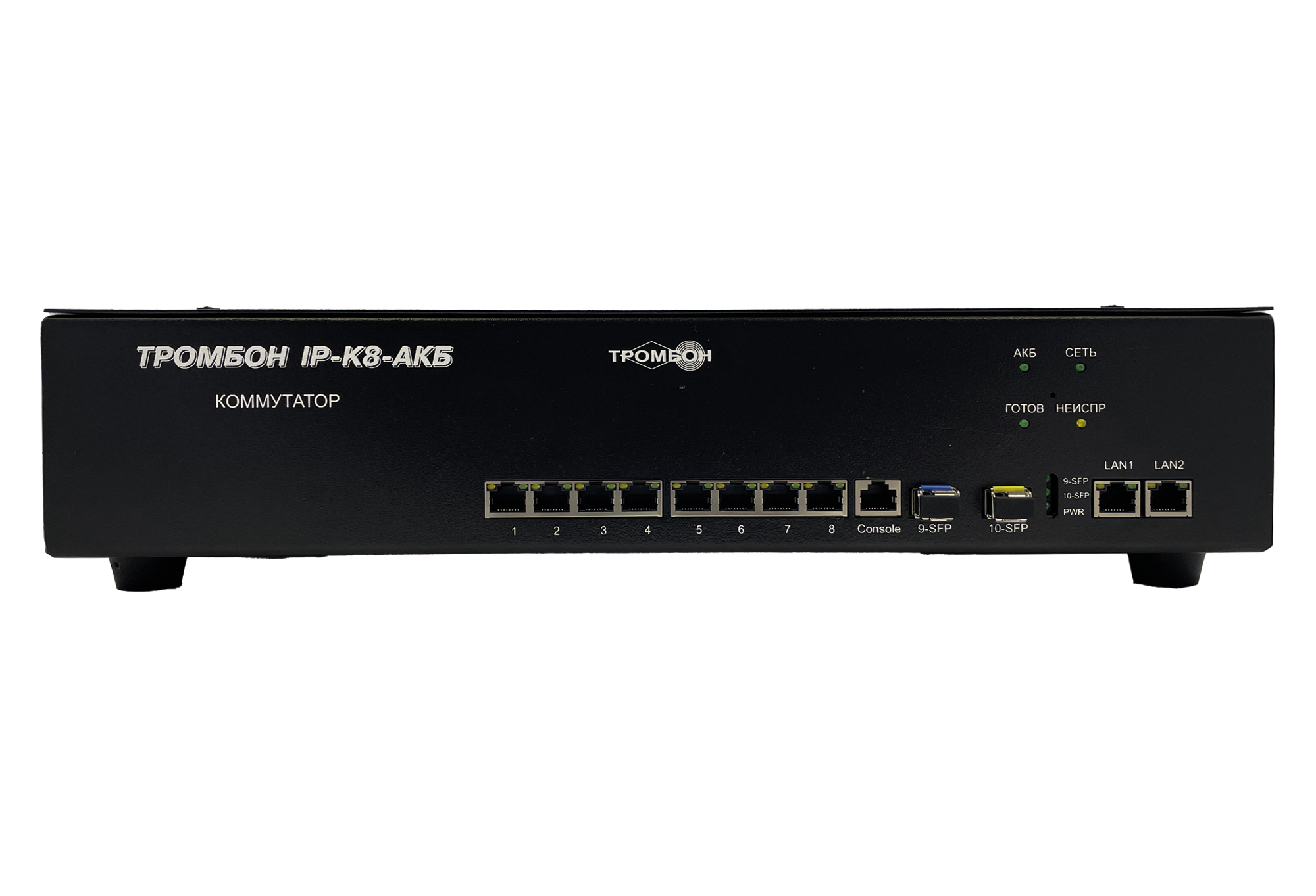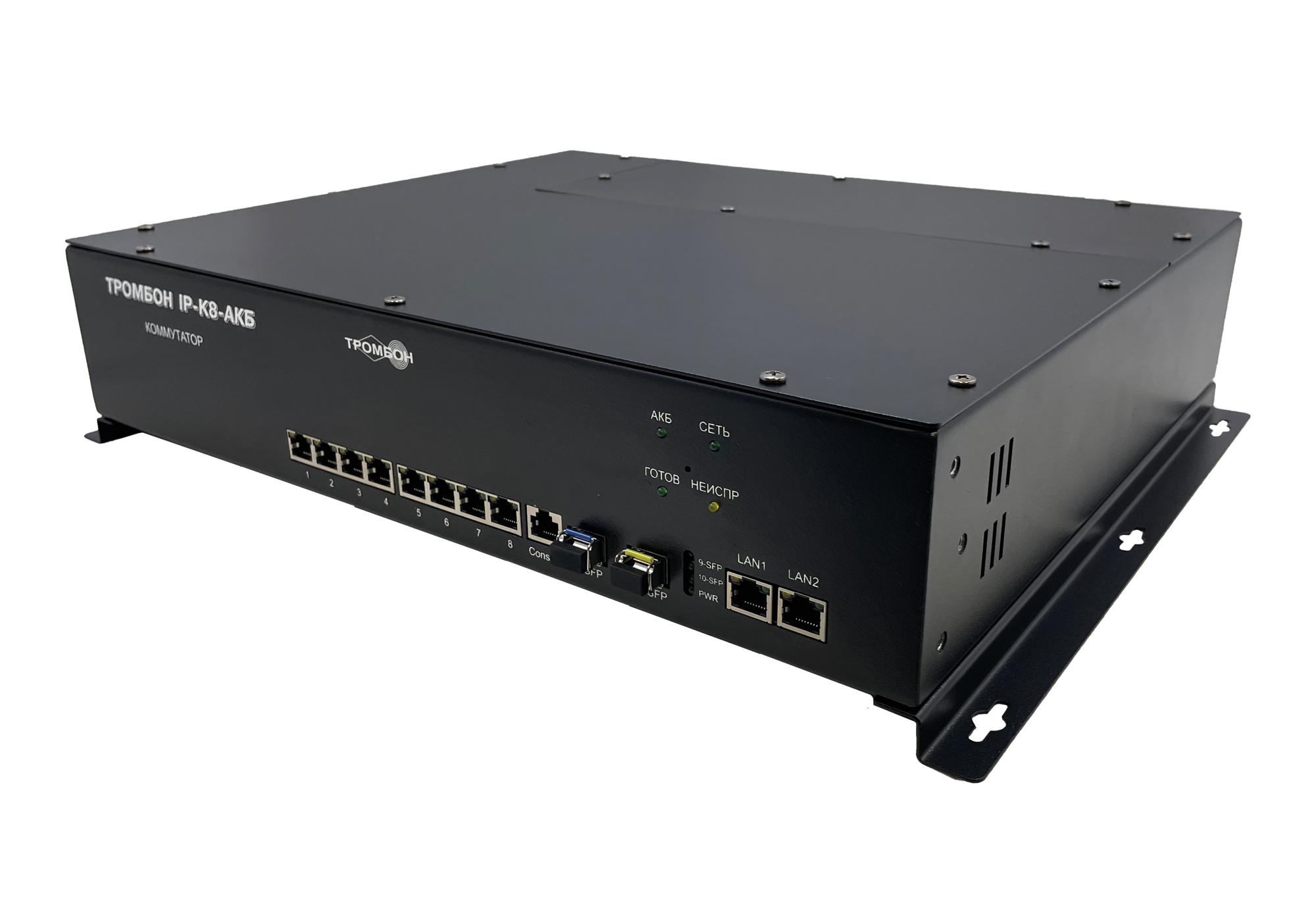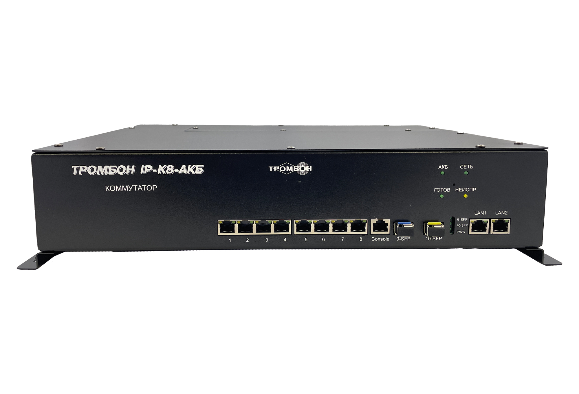 Коммутатор PoE промышленный неуправляемый Тромбон-IP-K8-Л. Оснащен 8х10/100/1000Mbp PoE (IEEE802.3af/at до 30Вт на порт 1-8, доступный бюджет мощности PoE 120Вт) и 2хSFP 1000. Исполнение 19”(1U) стоечное. Коммутатор имеет встроенный блок питания на 220В и возможность подключения внешних резервных АКБ 24В, для подержания работы коммутатора и подключенных по PoE устройств в отсутствии основного напряжения. Сертифицирован согласно требованиям пожарной безопасности ТР ЕАЭС-043/2017.