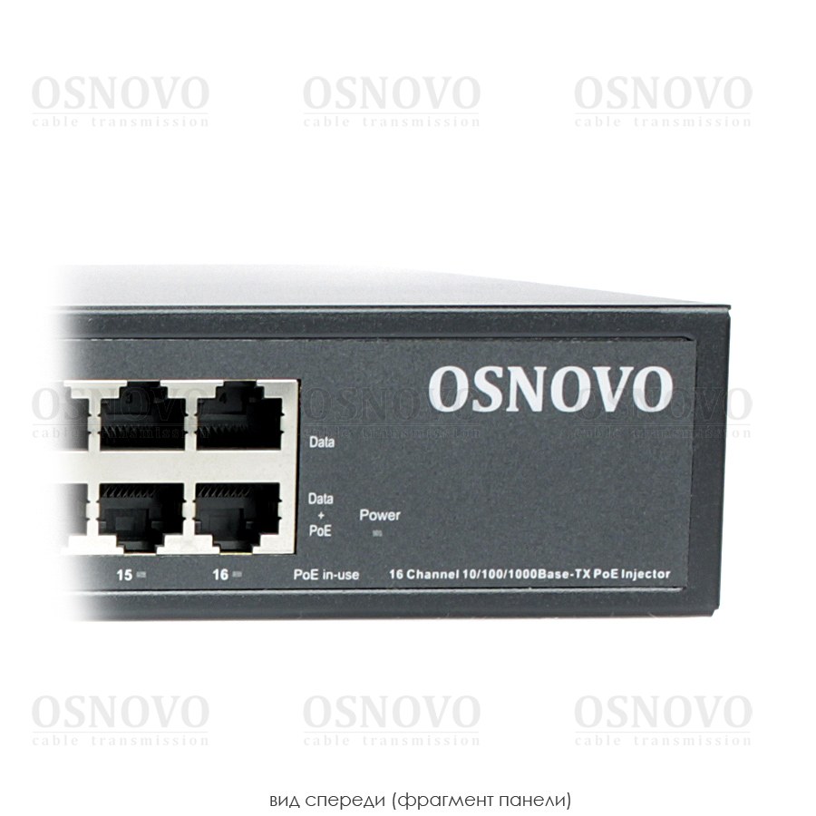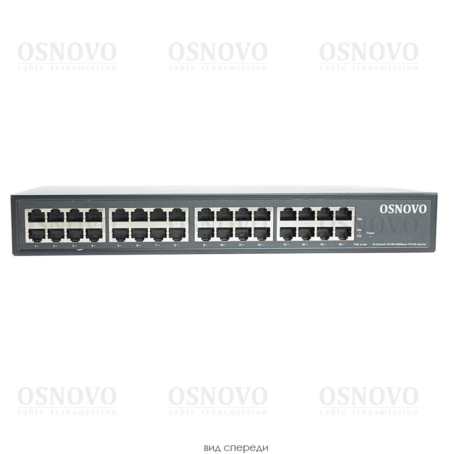 PoE-инжектор Gigabit Ethernet на 16 портов. Соответствует стандартам PoE IEEE 802.3af/at. Автоматическое определение PoE устройств. Мощность PoE на порт - до 30W. Суммарная мощность PoE - до 250W. Вх. - 16 x RJ45 (10/100/1000 Base-T), вых. - 16 x RJ45(10/100/1000 Base-T, PoE, IEEE 802.3af/at). Питание: AC100-240V. Встроенный БП. Монтаж в 19" стойку, крепление в комплекте. Размеры (ШхВхГ): 440x44x200мм. Рабочая температура: -5...+50 гр.C