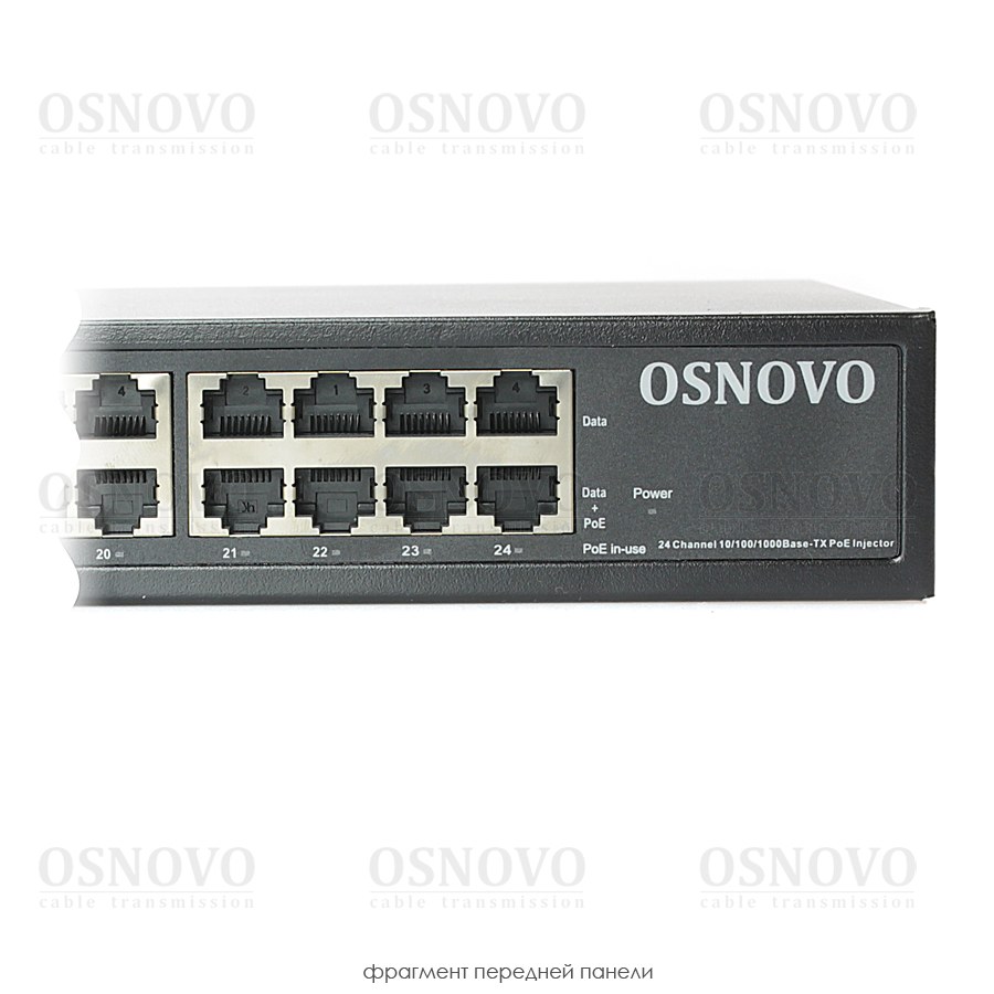 PoE-инжектор Gigabit Ethernet на 24 порта. Соответствует стандартам PoE IEEE 802.3af/at. Автоматическое определение PoE устройств. Мощность PoE на порт - до 30W. Суммарная мощность PoE - до 370W. Вх. - 24 x RJ45 (10/100/1000 Base-T), вых. - 24 x RJ45(10/100/1000 Base-T, PoE, IEEE 802.3af/at). Питание: AC100-240V. Встроенный БП. Монтаж в 19" стойку, крепление в комплекте. Размеры(ШхВхГ): 440x44x200мм. Вес: 3,7кг. Рабочая температура: -5...+50 гр. C