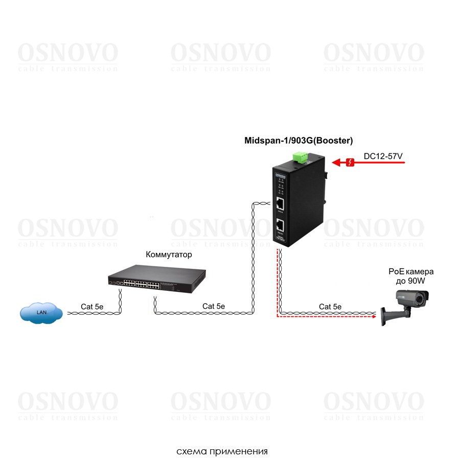 Промышленный PoE-инжектор Gigabit Ethernet на 90W с бустером напряжения. Соответствует стандартам PoE IEEE 802.3af/at/bt. Автоматическое определение PoE устройств. Мощность PoE - до 90W. Поддержка скорости 10/100/1000Base-T. вх. - RJ45 (10/100/1000 Base-T), вых. - RJ45(10/100/1000 Base-T, PoE, IEEE 802.3af/at/bt). Встроенная грозозащита 6kV.Размеры(ШхВхГ): 30x105x89 мм. Металлический корпус, Монтаж на DIN-рейку и на стену. Питание DC12-57V. Вес: 0,35 кг. Рабочая температура -40...+80 гр. С.