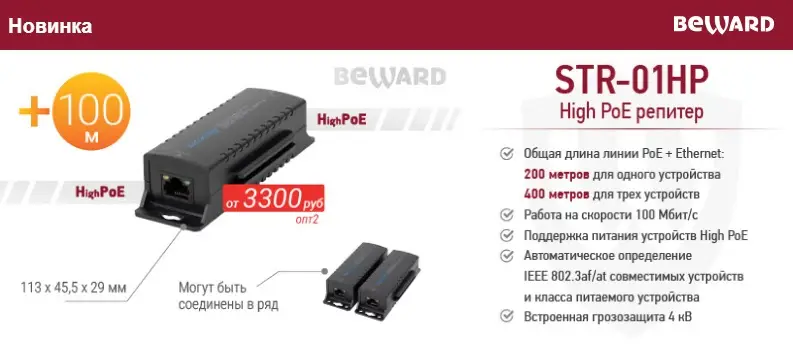 High PoE репитер BEWARD STR-01HP является оптимальным способом удлинить длину линии PoE + Ethernet в случае невозможности установки активного сетевого оборудования в середину линии.