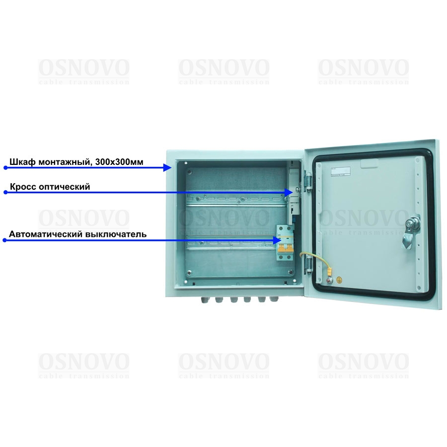 Уличная станция (уличный шкаф) с оптическим кроссом. В основе металлический шкаф с классом защиты IP66. Доступное место под установку оборудования на встроенные DIN-рейки: верхняя - 210мм, нижняя - 150мм. Может поставляться со встроенным оборудованием по заказу. Размеры (ШхВхГ): 300x300x210мм. Рабочая температура: -50…+50°С.