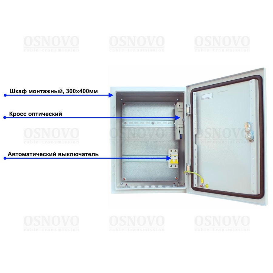 Уличная станция (уличный шкаф) с оптическим кроссом. В основе металлический шкаф с классом защиты IP66. Доступное место под установку оборудования на встроенные DIN-рейки: верхняя - 210мм, нижняя - 150мм. Может поставляться со встроенным оборудованием по заказу. Размеры (ШхВхГ): 300x400x210мм. Рабочая температура: -50…+50°С.