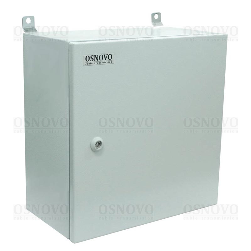 Уличная станция (уличный шкаф) с оптическим кроссом. В основе металлический шкаф с классом защиты IP66. Доступное место под установку оборудования на встроенные DIN-рейки: верхняя - 310мм, нижняя - 250мм. Может поставляться со встроенным оборудованием по заказу. Размеры (ШхВхГ): 400x400x210мм. Рабочая температура: -50…+50°С.