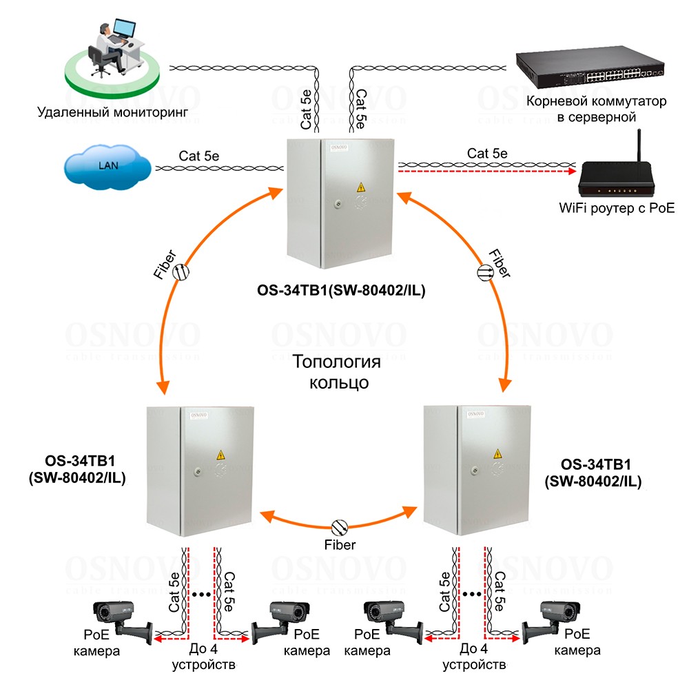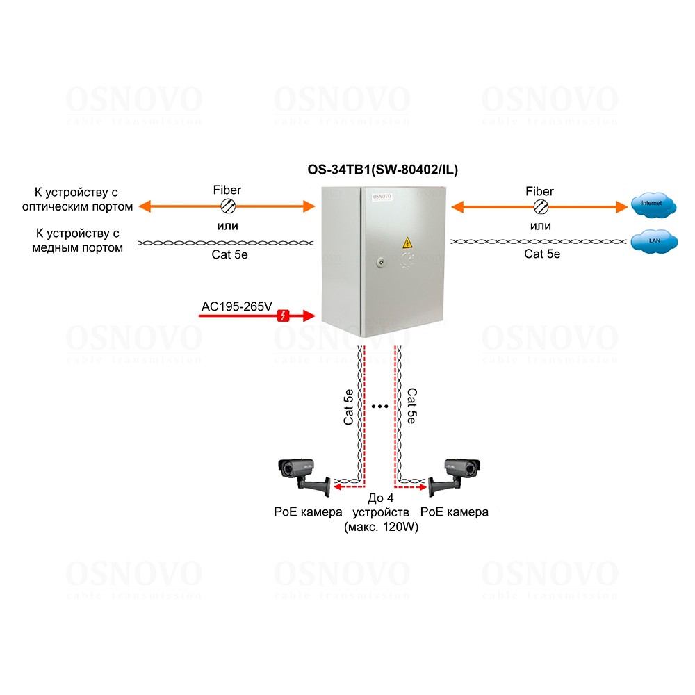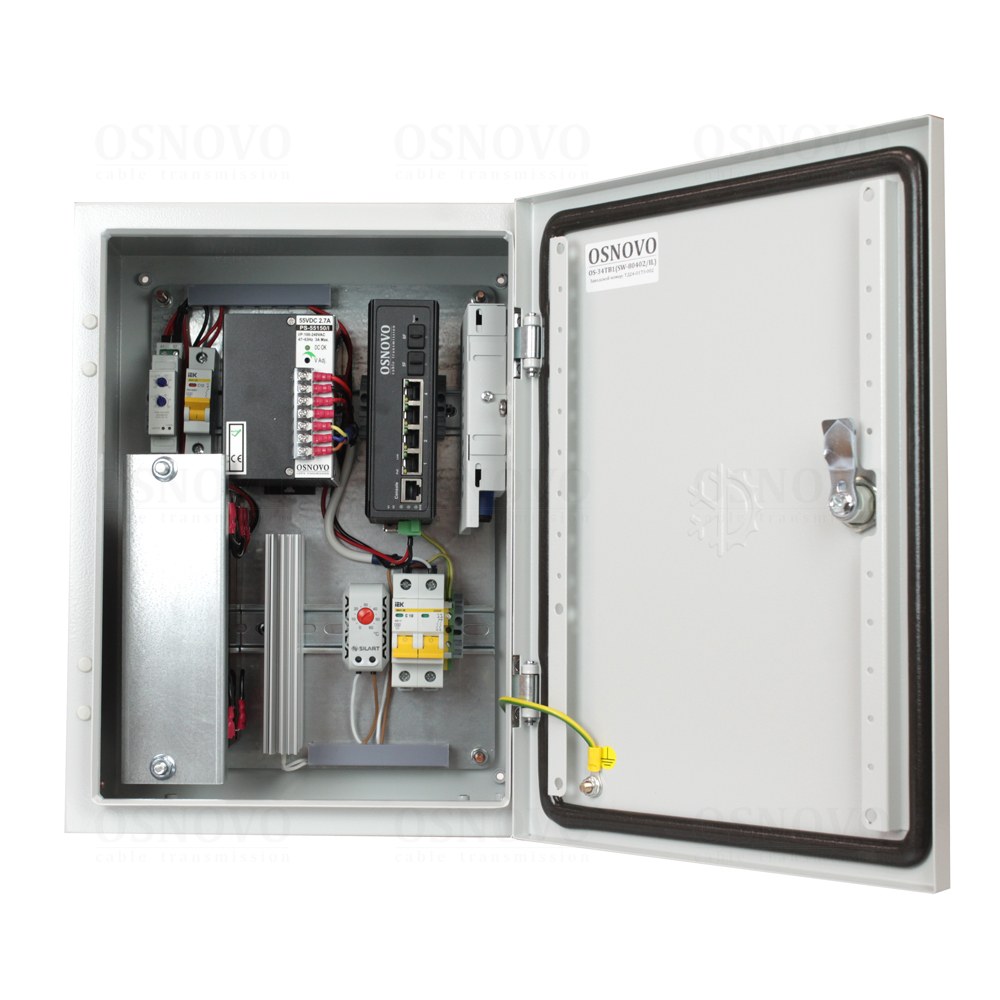 Уличный управляемый (L2) коммутатор с термостабилизацией и резервным питанием на базе уличной станции OSNOVO OS-34TB1. Порты: 4 x GE (10/100/1000Base-T) с PoE (до 30W) + 2 x GE SFP (1000Base-X). Суммарный бюджет PoE до 120W. Режим антизависания PoE устройств. Металлический шкаф (ШxВxГ): 300х400х210мм, питание AC195-265V. АКБ 48В(2,2Ач)), оптический кросс, исполнение IP66. Рабочая температура (температура окружающей среды): -40…+50°С, температура внутри станции -7…+55°С.