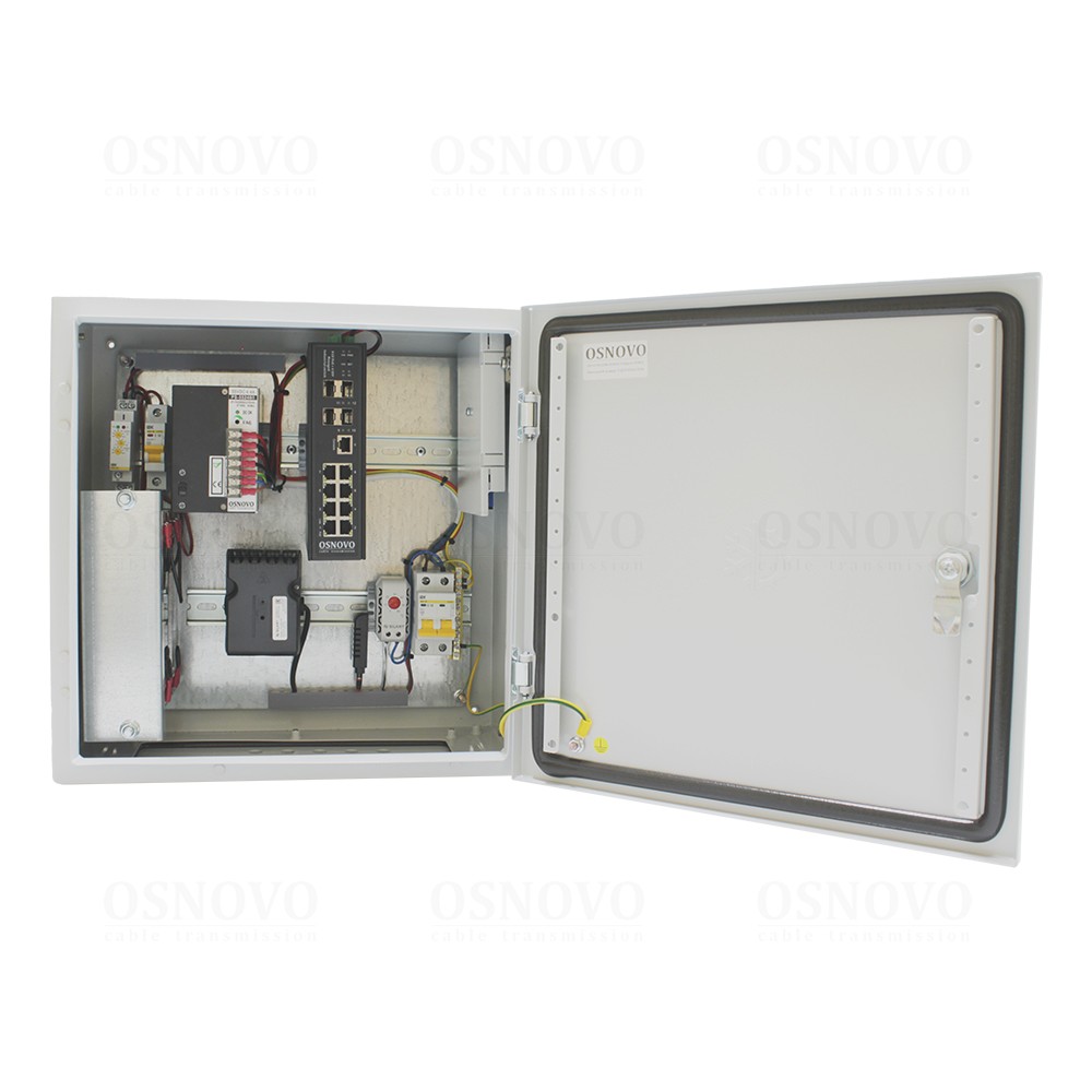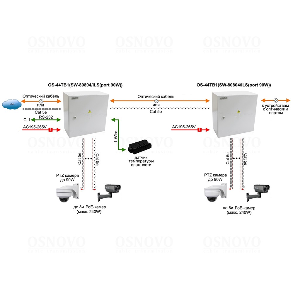 Уличный управляемый (L2+) коммутатор на 12 портов с термостабилизацией, резервным питанием и функцией мониторинга температуры/влажности/напряжения на базе уличной станции OS-44TB1. Порты: Порты: 1 x GE (10/100/1000Base-T) с PoE BT (до 90W) + 7xGE (10/100/1000Base-T) с PoE (до 30W) + 4xGE SFP (1000Base-X). Суммарный бюджет PoE до 240W. Металлический шкаф (ШxВxГ): 400х400х210мм, питание AC195-265V. АКБ 48В(2,2Ач)), оптический кросс на 4 порта, исполнение IP66. Рабочая температура (температура окружающей среды): -60…+50°С, температура внутри станции -10…+55°С.