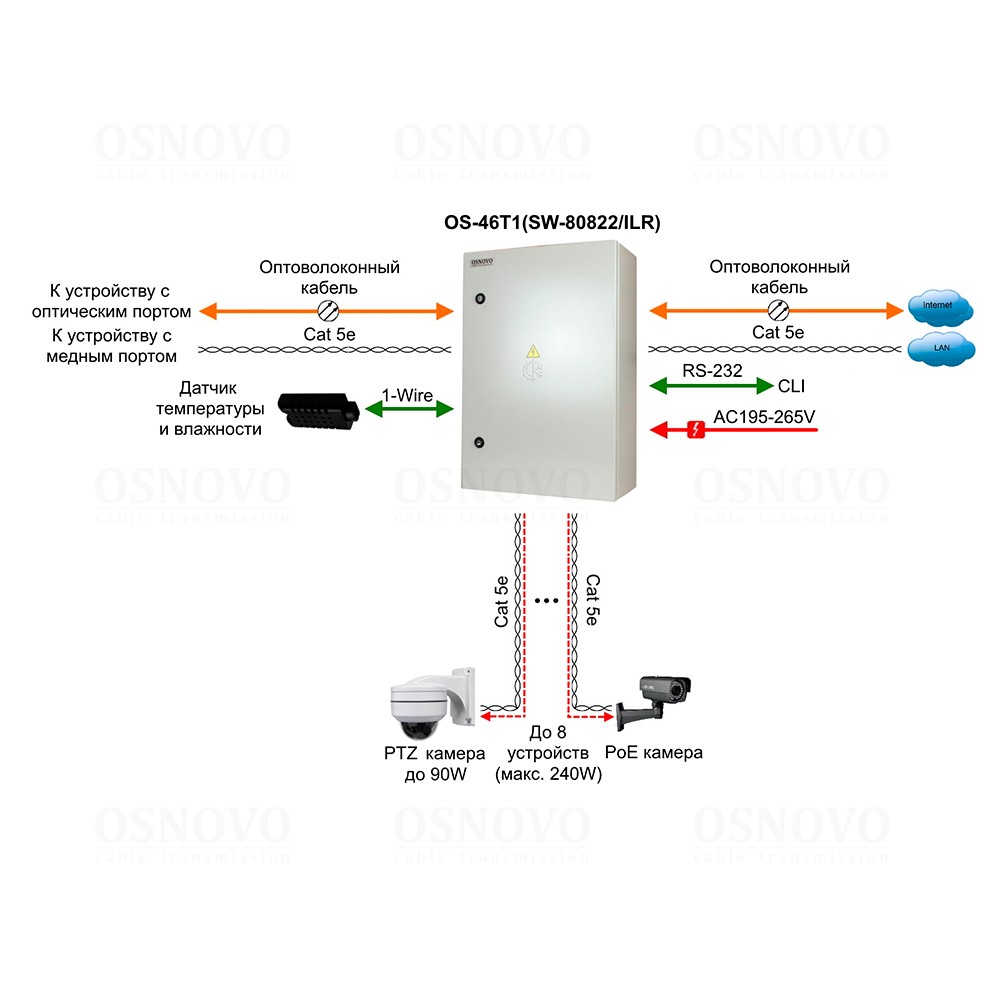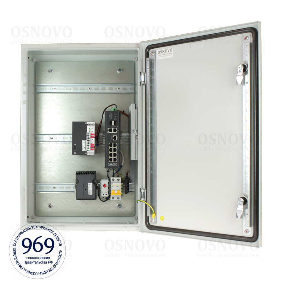 Уличный управляемый (L2+) коммутатор на 12 портов с термостабилизацией на базе уличной станции OSNOVO OS-46T1. Порты: 2xGE (10/100/1000Base-T) с PoE BT (до 90W) + 6xGE (10/100/1000Base-T) с PoE (до 30W) + 2xGE RJ45 (10/100/1000Base-T)+ 2 GE SFP (1000Base-X). Соответствует стандартам PoE IEEE 802.3af/at/bt. Автоматическое определение и режим антизависания PoE устройств, управление питанием. Металлический шкаф (ШxВxГ): 400х600х210мм, питание AC195-265V (промышленный БП с выходным напряжением DC48V - модель: PS-55240/I), cуммарный бюджет PoE до 240W, оптический кросс, исполнение IP66. Рабочая температура (температура окружающей среды): -60…+50°С, температура внутри станции -10…+55°С. Имеется Сертификат Транспортной Безопасности.