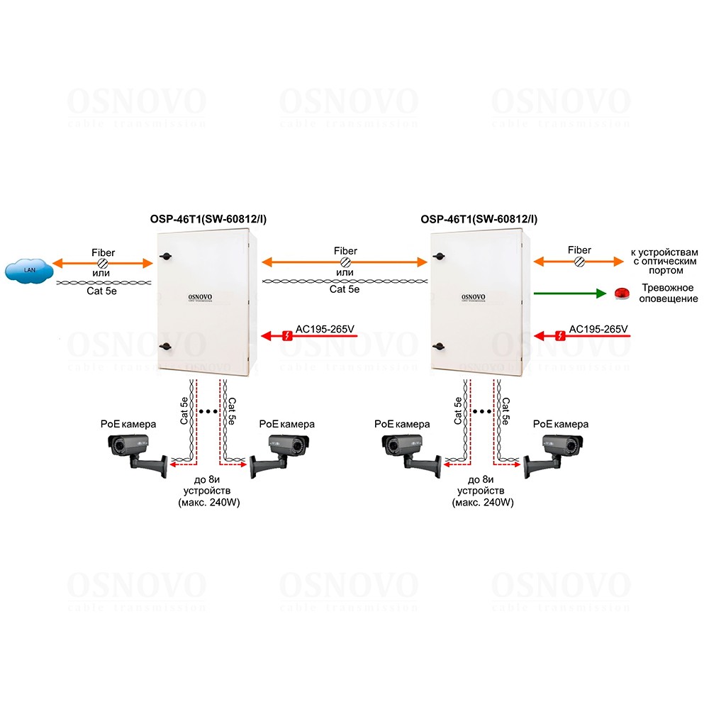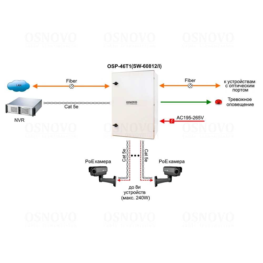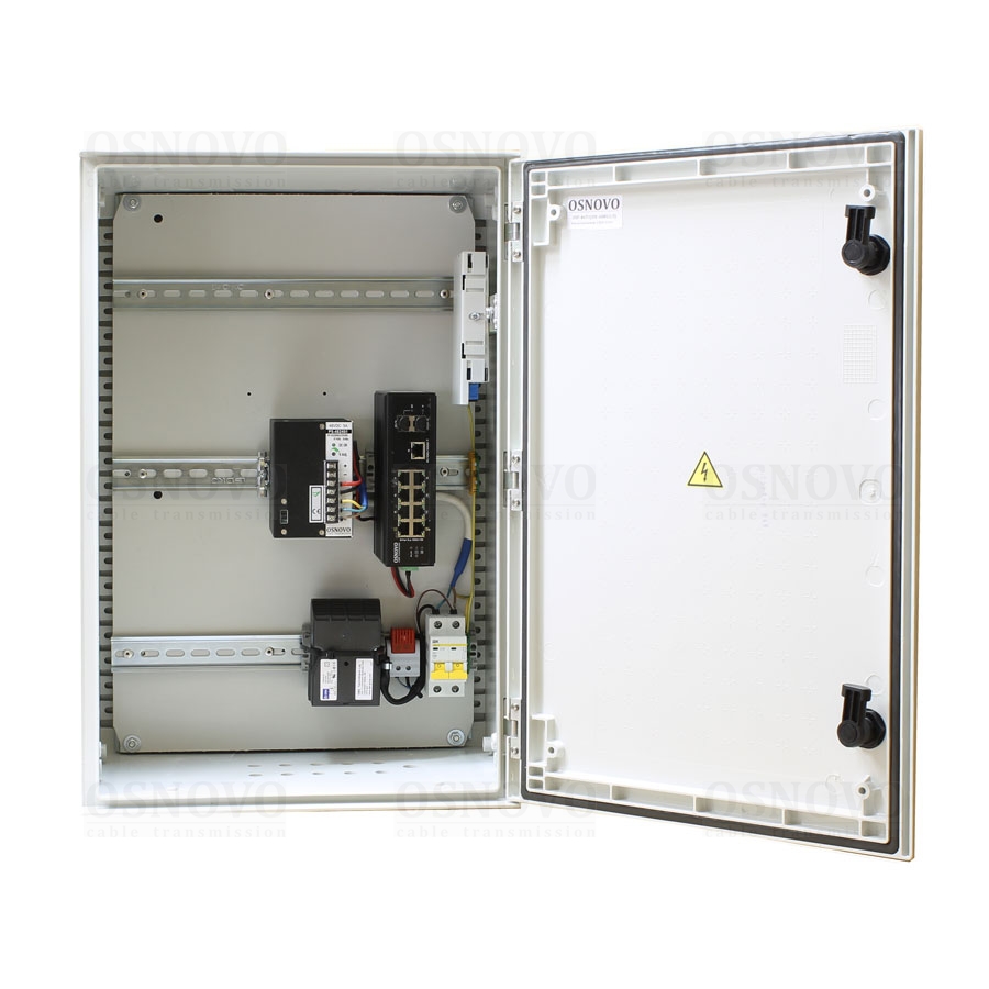 Уличный коммутатор с термостабилизацией на базе уличной станции OSNOVO OSP-46T1. Порты: 6 x FE (10/100Base-T) с PoE (до 30W) + 2 x FE (10/100Base-T) с PoE (до 60W) + 1 x GE (10/100/1000Base-T) + 2 x GE SFP (1000Base-X). Суммарный бюджет PoE до 240W. Режим антизависания и режим CCTV (удлинения линий связи по 8-ми PoE портам до 250м (скорость до 10Мбит/с)). Пластиковый шкаф (ШxВxГ): 400х600х230мм, питание AC195-265V, оптический кросс. Рабочая температура (температура окружающей среды): -60…+50°С, температура внутри станции 0…+55°С, исполнение IP66, защитный козырёк.