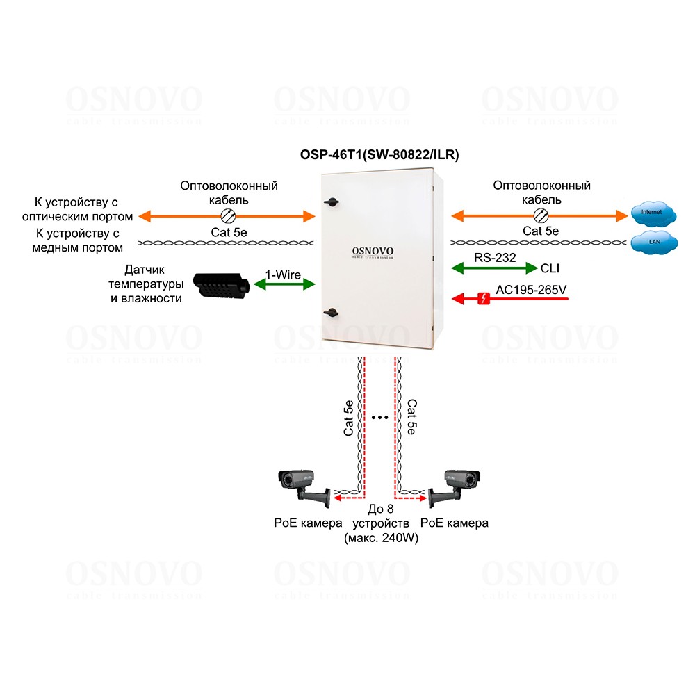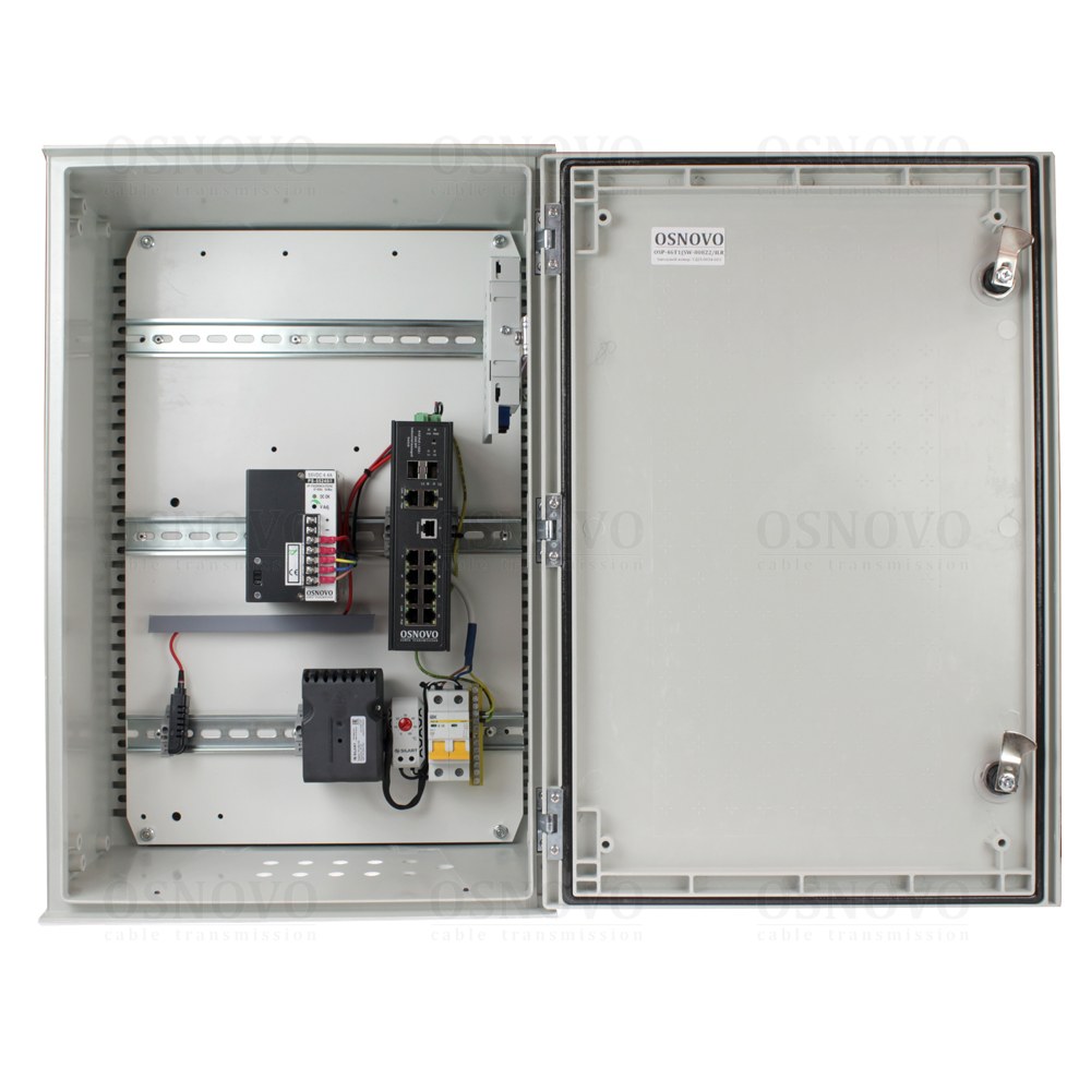 Уличный управляемый (L2+) коммутатор на 12 портов с термостабилизацией и функцией мониторинга температуры/влажности/напряжения на базе уличной станции OSNOVO OSP-46T1. Порты: Порты: 1 x GE (10/100/1000Base-T) с PoE BT (до 90W) + 7 x GE (10/100/1000Base-T) с PoE (до 30W) + 2 x GE RJ45 (10/100/1000Base-T)+ 2 GE SFP (1000Base-X) Соответствует стандартам PoE IEEE 802.3af/at/bt. Автоматическое определение и режим антизависания PoE устройств, управление питанием. Пластиковый шкаф (ШxВxГ): 400х600х230мм, питание AC195-265V (промышленный БП с выходным напряжением DC48V - модель: PS-55240/I), cуммарный бюджет PoE до 240W, оптический кросс, исполнение IP66, защитный козырёк. Рабочая температура (температура окружающей среды): -60…+50°С, температура внутри станции 0…+55°С. Имеется Сертификат Транспортной Безопасности.