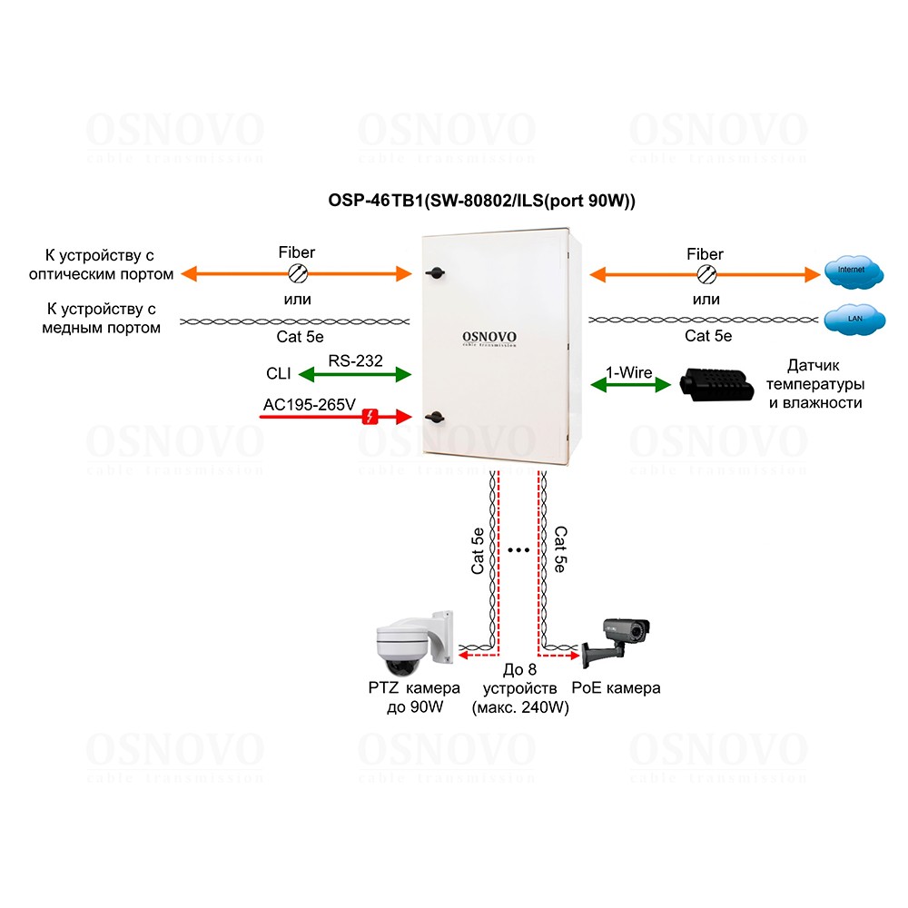 Уличный управляемый (L2+) коммутатор на 10 портов с термостабилизацией, резервным питанием и функцией мониторинга температуры/влажности/напряжения на базе уличной станции OSP-46TB1. Порты: 1 x GE (10/100/1000Base-T) с PoE (до 90W, IEEE 802.3bt) + 7 x GE (10/100/1000Base-T) с PoE (до 30W) + 2 x GE SFP (1000Base-X). Суммарный бюджет PoE до 240W. Пластиковый шкаф (ШxВxГ): 400х600х230мм, питание AC195-265V. АКБ 48В(7Ач)), оптический кросс, исполнение IP66, защитный козырёк. Рабочая температура (температура окружающей среды): -60…+50°С, температура внутри станции 0…+55°С.