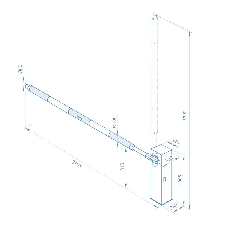 Ширина перекрываемого проезда 1,3…2,7 м; длина стрелы шлагбаума 1,5…3,0 м; время открытия 0,7 - 1,2 сек; интенсивность работы до 100 %; максимальная пропускная способность до 15000 ТС/сутки; 220 В; 1 А; 220 Вт(с дополнительным оборудованием); IP54; 260х340х1050 мм; 62 кг