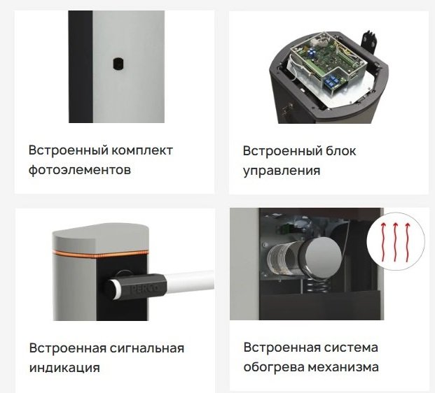 "Ширина проезда - до 6,0 м, скорость открытия 6 с, интенсивность использования - 100%, 220 В AC, 0,9 А, привод и плата управления 24В DC, IP54, Материал оцинкованная сталь, покрытая порошковой краской. -40 до +55°C, 370х1070х287 мм, без стрелы. Наработка на отказ - 3 000 000 циклов.