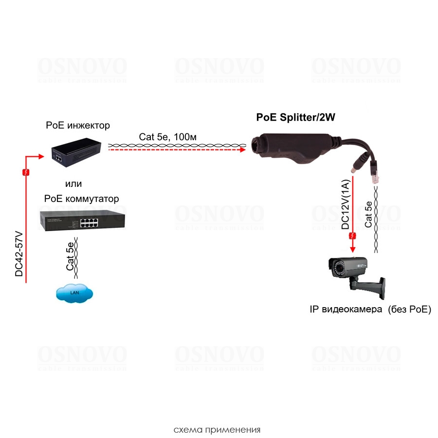 Уличный PoE-сплиттер Fast Ethernet. Соответствует стандартам PoE IEEE 802.3af. Предназначен для питания оконечных сетевых устройств, не поддерживающих PoE. Порты: вх. - RJ45(10/100 Base-T, IEEE 802.3af), вых. - кабель RJ45(10/100 Base-T)/штекер 5.5x2.1 мм. Входное напряжение: DC42-57V. Выходное напряжение: DC12V/1A. Класс защиты - IP66. Размеры (ШхВхГ) - 85 x 27 x 30 мм. Длина кабеля - 8см. Рабочая температура -40 ... +60°C.