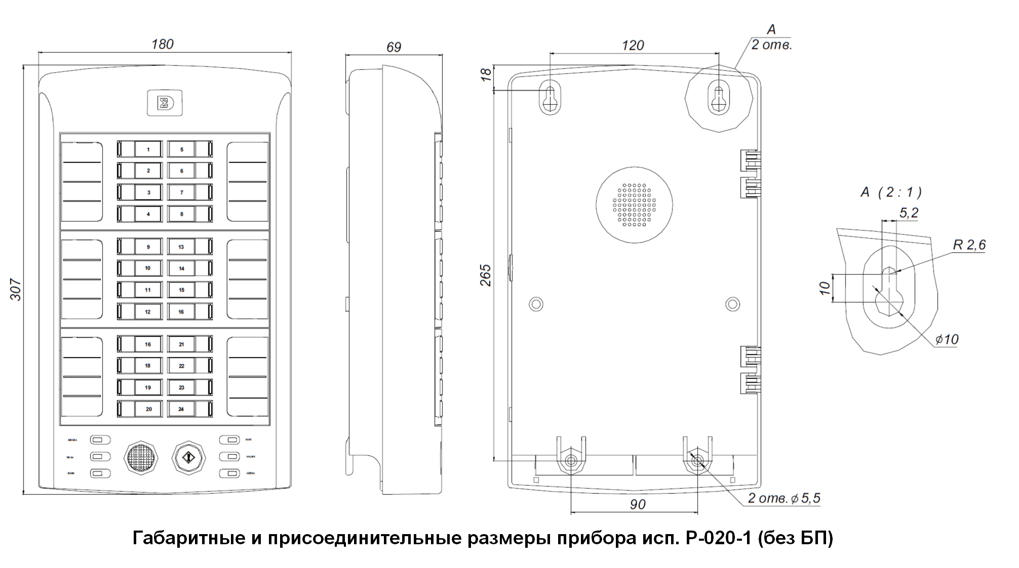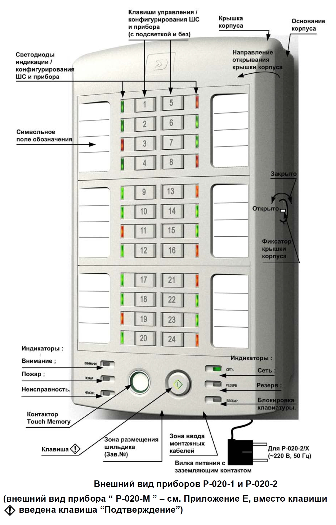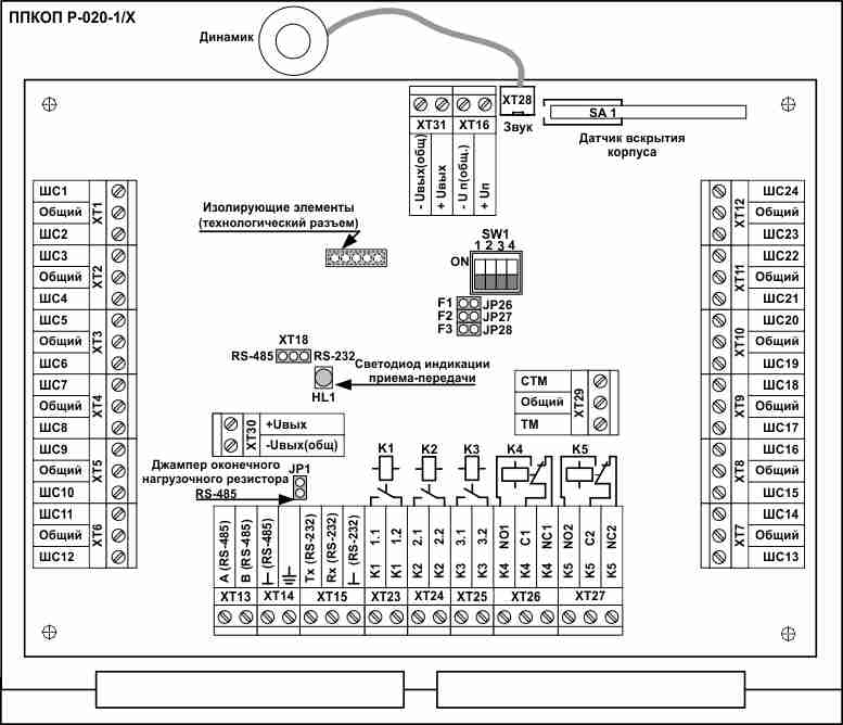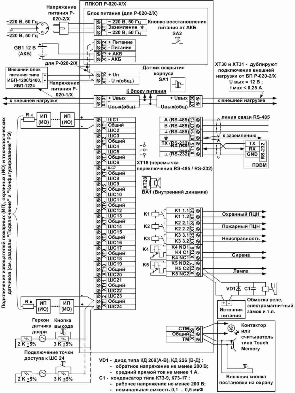 Прибор приёмно-контрольный охранно-пожарный “Р-020” (24 универсальных ШС, 5 реле управления, 500 пользователей, Touch Memory, точка доступа, RS-232, RS-485).