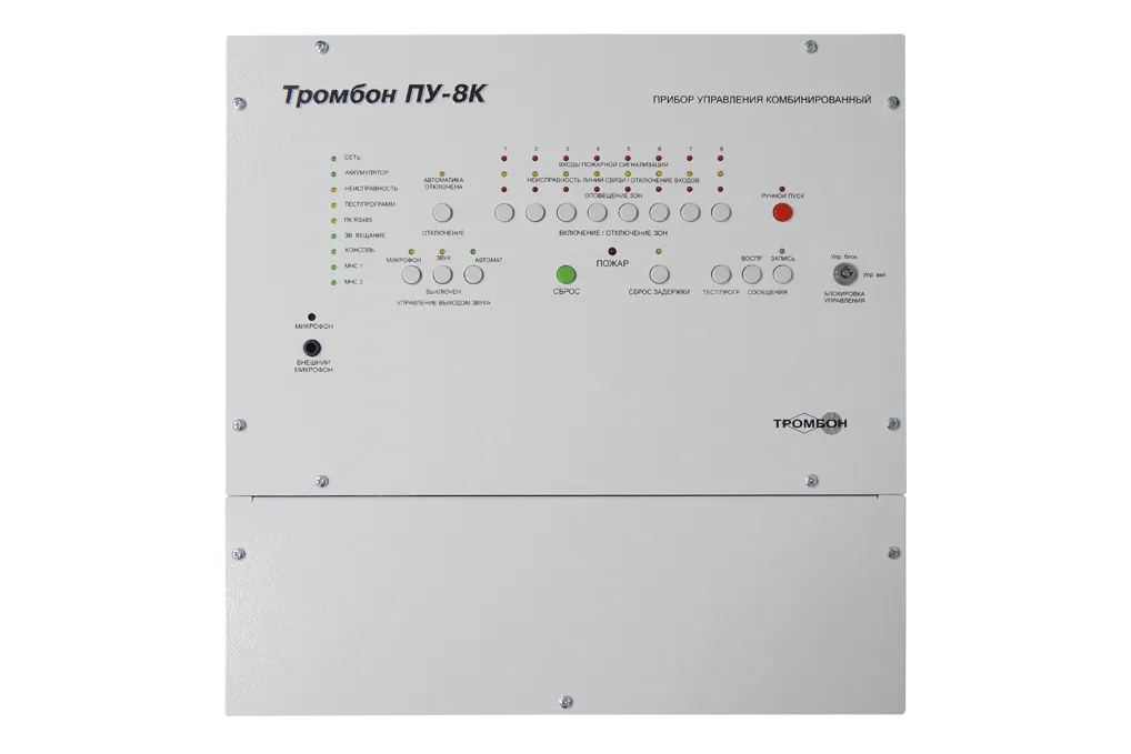 Прибор управления Тромбон ПУ-8К предназначен для построения системы оповещения и управления эвакуацией (СОУЭ) 3-го и 4-го типов. Оснащен встроенным усилителем мощности, системой резервного питания, 2 входами МЧС, гибкими настройками алгоритмов оповещения, интеллектуальной системой контроля всех линий связи, портом для подключения удаленных консолей Тромбон УК, интерфейсом RS-485 для подключения к ПК и сопряжения с системой безопасности АРМ "Орион Про". Для построения полноценной системы оповещения нужен только Тромбон ПУ-8К и речевые оповещатели «Глагол».Преимущества: - Звуковое оповещение о пожаре - Управление системами светового оповещения контроля доступа и эвакуационного освещения - Встроенные усилители мощности - Встроенный микрофон - Подключение до 8 Тромбон УК - 2 входа МЧС с квитированием - Выходная мощность 240 Вт (2х120 Вт) - Система резервного питания - Система сертифицирована согласно ТР ЕАЭС 043/2017 - Настенное исполнение