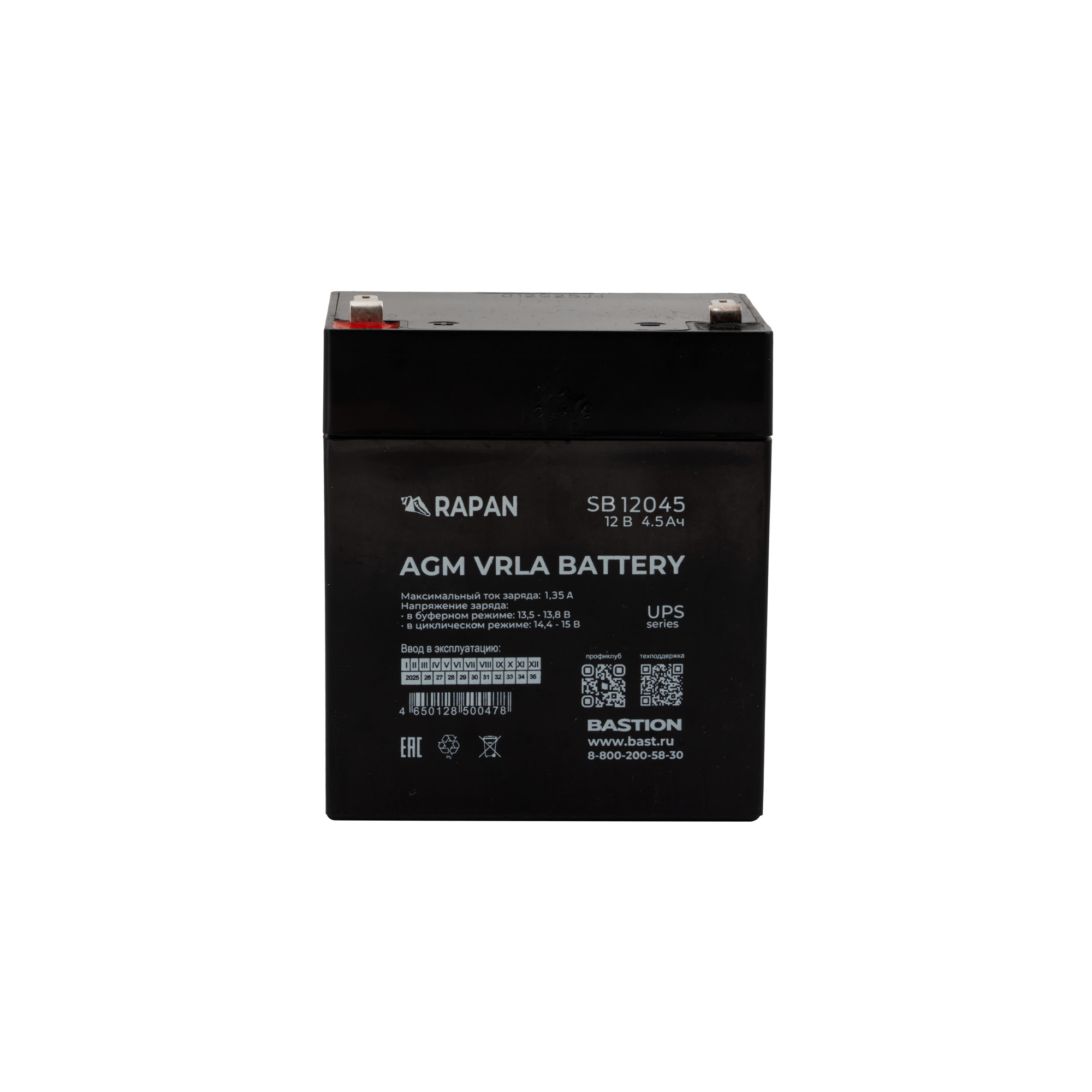 <div><h2>Технические характеристики <!-- -->RAPAN SB 12045</h2><div><figure class="table"><table class="table-bordered table-striped"><tbody><tr><td style="text-align:center;"><strong>№ п/п</strong></td><td style="text-align:center;" colspan="2"><strong>Наименование параметра</strong></td><td style="text-align:center;"><strong>Значение параметра</strong></td></tr><tr><td>1</td><td colspan="2">Номинальное напряжение, В</td><td style="text-align:center;"><strong>12 </strong></td></tr><tr><td rowspan="4">2</td><td rowspan="4">Номинальная ёмкость, Ач (при 25°С)</td><td>через 20 часов (ток разряда – 0,05С)</td><td style="text-align:center;"><strong>4,5</strong></td></tr><tr><td>через 10 часов (ток разряда – 0,1С)</td><td style="text-align:center;"><strong>3,8</strong></td></tr><tr><td>через 5 часов (ток разряда – 0,2С)</td><td style="text-align:center;"><strong>3,6</strong></td></tr><tr><td>через 1 час (ток разряда – 1С)</td><td style="text-align:center;"><strong>2,8</strong></td></tr><tr><td rowspan="4">3</td><td rowspan="4">% ёмкости через 20 часов в зависимости от температуры эксплуатации</td><td>при 40°С</td><td style="text-align:center;"><strong>102</strong></td></tr><tr><td>при 25°С</td><td style="text-align:center;"><strong>100</strong></td></tr><tr><td>при 0°С</td><td style="text-align:center;"><strong>85</strong></td></tr><tr><td>при -15°С</td><td style="text-align:center;"><strong>65</strong></td></tr><tr><td>4</td><td colspan="2">Внутреннее сопротивление, мОм (при 25°С и полностью заряженной АКБ)</td><td style="text-align:center;"><strong>60</strong></td></tr><tr><td rowspan="2">5</td><td rowspan="2">Заряд постоянным напряжением (при 25°С)</td><td>Циклический режим, В</td><td style="text-align:center;"><strong> 14,4 ÷ 15,0</strong></td></tr><tr><td>Буферный режим, В</td><td style="text-align:center;"><strong> 13,5 ÷ 13,8</strong></td></tr><tr><td>6</td><td colspan="2">Максимальный ток заряда, А</td><td style="text-align:center;"><strong>1,35</strong></td></tr><tr><td rowspan="3">7</td><td rowspan="3">% ёмкости после хранения (при 25°С)</td><td>3 месяца</td><td style="text-align:center;"><strong>92</strong></td></tr><tr><td>6 месяца</td><td style="text-align:center;"><strong>83</strong></td></tr><tr><td>12 месяца</td><td style="text-align:center;"><strong>65</strong></td></tr><tr><td>8</td><td colspan="2">Габаритные размеры ШхГхВ без упаковки, мм, не более</td><td style="text-align:center;"><strong>70х90х106</strong></td></tr><tr><td>9</td><td colspan="2">Масса без упаковки, не более, кг</td><td style="text-align:center;"><strong>1,33</strong></td></tr><tr><td rowspan="3">10</td><td rowspan="3">Диапазон рабочих температур, °С</td><td>заряд</td><td style="text-align:center;"><strong> от -10 до +50</strong></td></tr><tr><td>разряд</td><td style="text-align:center;"><strong> от -20 до +50</strong></td></tr><tr><td>хранение</td><td style="text-align:center;"><strong> от -35 до +50</strong></td></tr><tr><td>11</td><td colspan="2">Тип клеммы</td><td style="text-align:center;"><strong>F1 нож</strong></td></tr></tbody></table></figure></div></div>