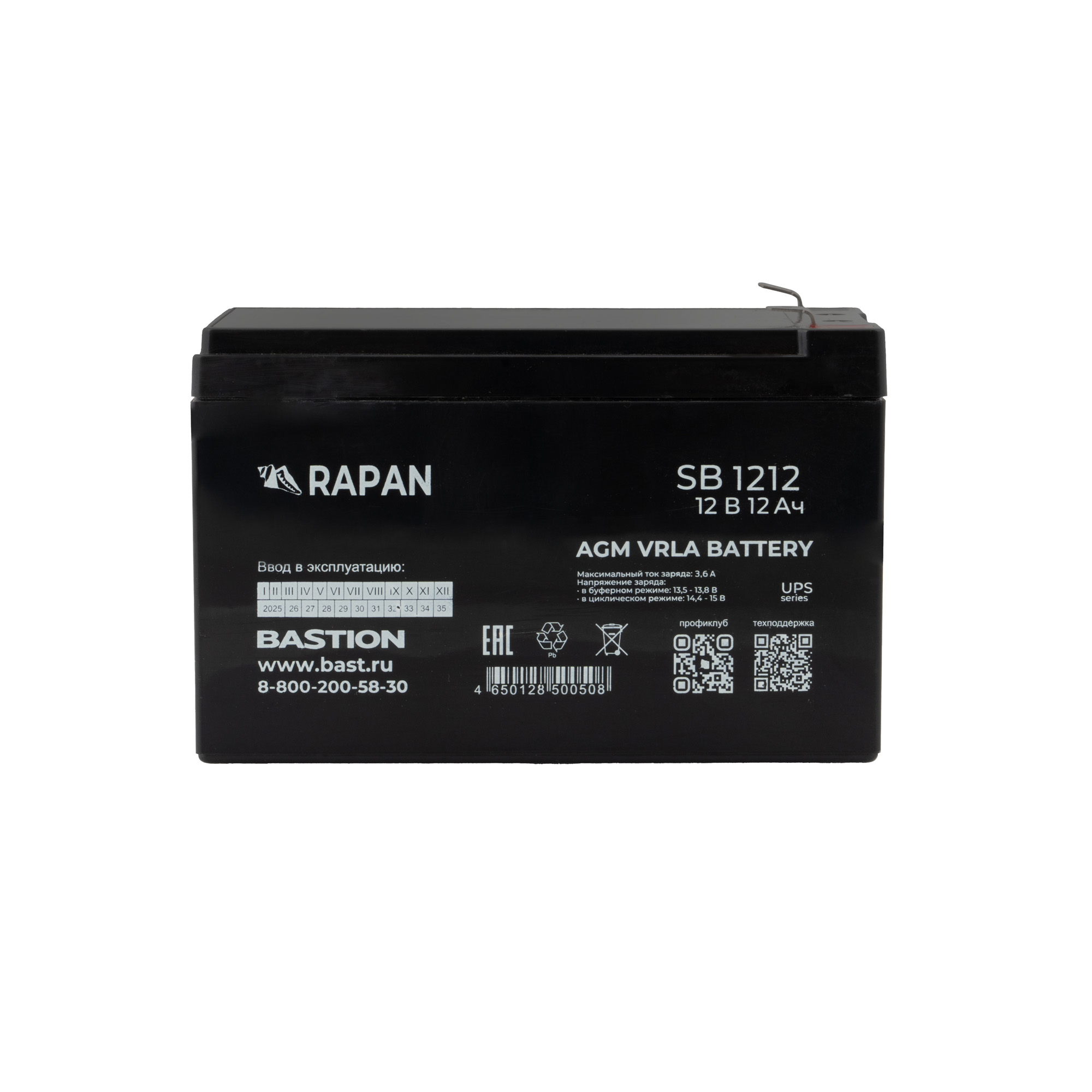 <div><h2>Технические характеристики <!-- -->RAPAN SB 1212</h2><div><figure class="table"><table class="table-bordered table-striped"><tbody><tr><td style="text-align:center;"><strong>№ п/п</strong></td><td style="text-align:center;" colspan="2"><strong>Наименование параметра</strong></td><td style="text-align:center;"><strong>Значение параметра</strong></td></tr><tr><td>1</td><td colspan="2">Номинальное напряжение, В</td><td style="text-align:center;"><strong>12 </strong></td></tr><tr><td rowspan="4">2</td><td rowspan="4">Номинальная ёмкость, Ач (при 25°С)</td><td>через 20 часов (ток разряда – 0,05С)</td><td style="text-align:center;"><strong>12</strong></td></tr><tr><td>через 10 часов (ток разряда – 0,1С)</td><td style="text-align:center;"><strong>9,4</strong></td></tr><tr><td>через 5 часов (ток разряда – 0,2С)</td><td style="text-align:center;"><strong>9,1</strong></td></tr><tr><td>через 1 час (ток разряда – 1С)</td><td style="text-align:center;"><strong>6,6</strong></td></tr><tr><td rowspan="4">3</td><td rowspan="4">% ёмкости через 20 часов в зависимости от температуры эксплуатации</td><td>при 40°С</td><td style="text-align:center;"><strong>102</strong></td></tr><tr><td>при 25°С</td><td style="text-align:center;"><strong>100</strong></td></tr><tr><td>при 0°С</td><td style="text-align:center;"><strong>85</strong></td></tr><tr><td>при -15°С</td><td style="text-align:center;"><strong>65</strong></td></tr><tr><td>4</td><td colspan="2">Внутреннее сопротивление, мОм (при 25°С и полностью заряженной АКБ)</td><td style="text-align:center;"><strong>30</strong></td></tr><tr><td rowspan="2">5</td><td rowspan="2">Заряд постоянным напряжением (при 25°С)</td><td>Циклический режим, В</td><td style="text-align:center;"><strong> 14,4 ÷ 15,0</strong></td></tr><tr><td>Буферный режим, В</td><td style="text-align:center;"><strong> 13,5 ÷ 13,8</strong></td></tr><tr><td>6</td><td colspan="2">Максимальный ток заряда, А</td><td style="text-align:center;"><strong>3,6</strong></td></tr><tr><td rowspan="3">7</td><td rowspan="3">% ёмкости после хранения (при 25°С)</td><td>3 месяца</td><td style="text-align:center;"><strong>92</strong></td></tr><tr><td>6 месяца</td><td style="text-align:center;"><strong>83</strong></td></tr><tr><td>12 месяца</td><td style="text-align:center;"><strong>65</strong></td></tr><tr><td>8</td><td colspan="2">Габаритные размеры ШхГхВ без упаковки, мм, не более</td><td style="text-align:center;"><strong>98х151х100</strong></td></tr><tr><td>9</td><td colspan="2">Масса без упаковки, не более, кг</td><td style="text-align:center;"><strong>3,1</strong></td></tr><tr><td rowspan="3">10</td><td rowspan="3">Диапазон рабочих температур, °С</td><td>заряд</td><td style="text-align:center;"><strong> от -10 до +50</strong></td></tr><tr><td>разряд</td><td style="text-align:center;"><strong> от -20 до +50</strong></td></tr><tr><td>хранение</td><td style="text-align:center;"><strong> от -35 до +50</strong></td></tr><tr><td>11</td><td colspan="2">Тип клеммы</td><td style="text-align:center;"><strong>F2 нож</strong></td></tr></tbody></table></figure></div></div>