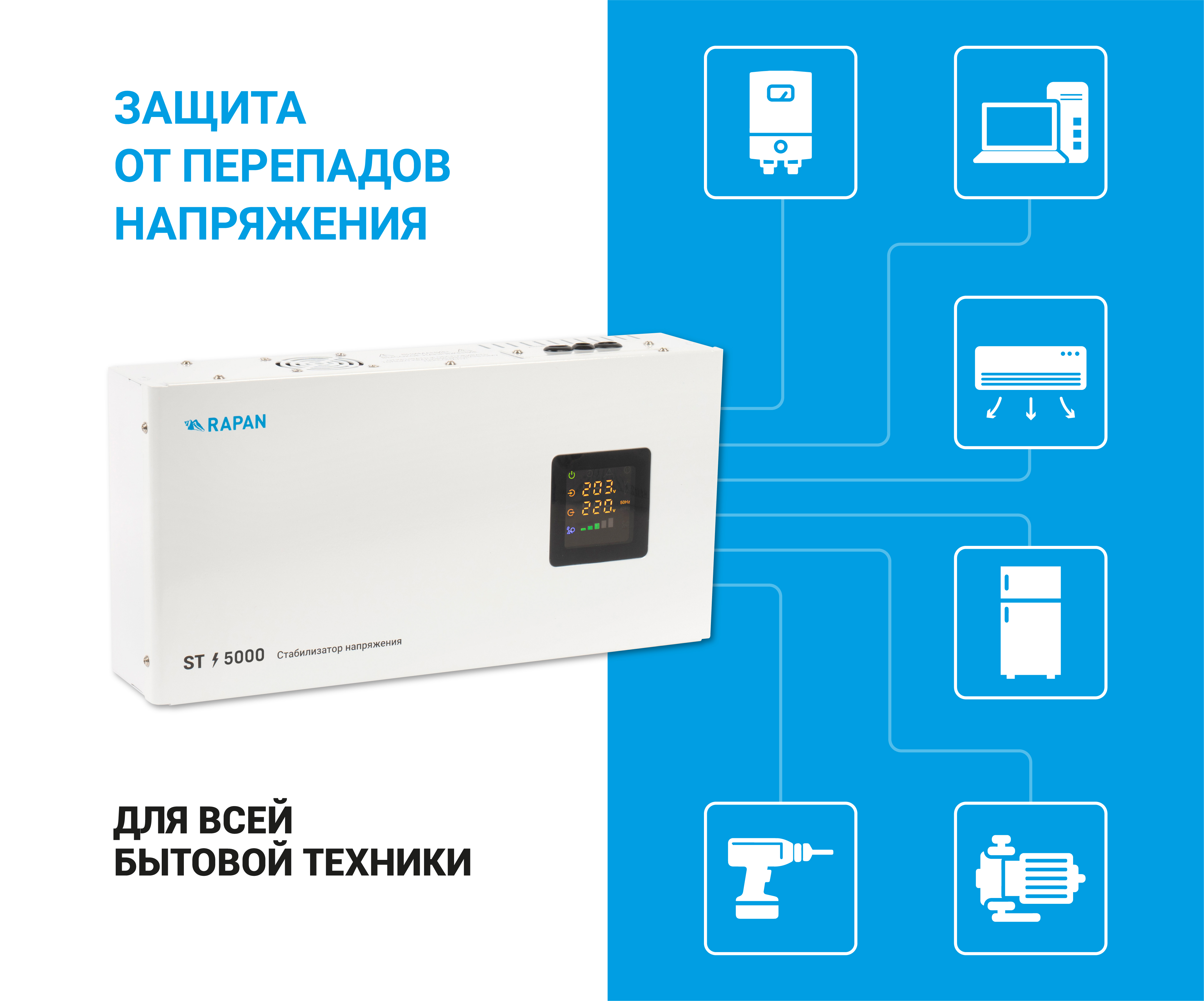 RAPAN ST – релейный стабилизатор, разработанный для защиты вашего электрооборудования от перепадов напряжения.