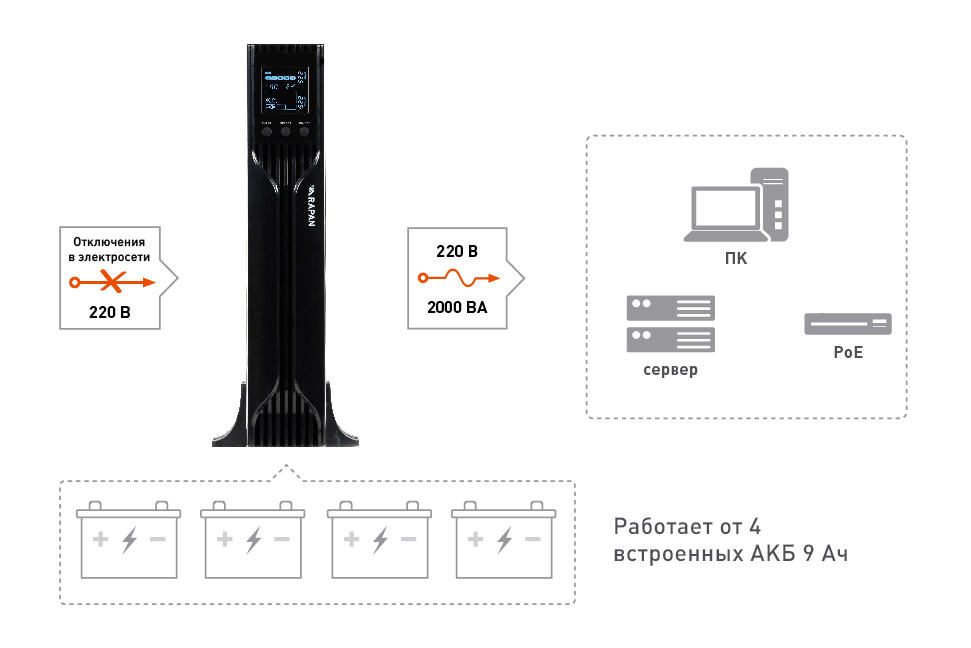 RAPAN-UPS 2000-RACK-IN-4X9-E представляет собой современный экономичный источник бесперебойного питания с функциями защиты и контроля и обеспечивает подключённые к его выходу устройства длительным, стабилизированным электропитанием при отсутствии напряжения сети, используя при этом электроэнергию, запасённую в аккумуляторных батареях.
