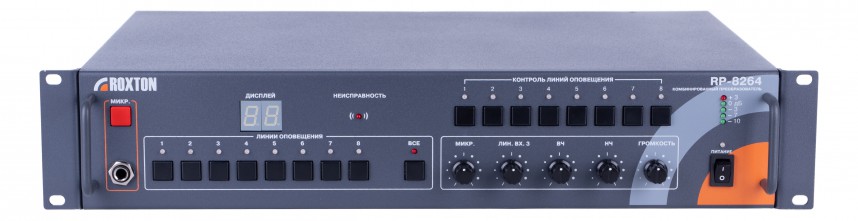 Универсальный порт для усилителей до 4х500 Вт/100 В, 8 зон, 1 мик.(приор.)/2 лин.(приор.)/1 лин. вх., ГО и ЧС, RS-485, контроль всех соединений, подключение RM-8064 х 8, управление световыми табло +24В, зарядное устройство для акк. +24В, расширение до 512 зон/3 каналов, 2U