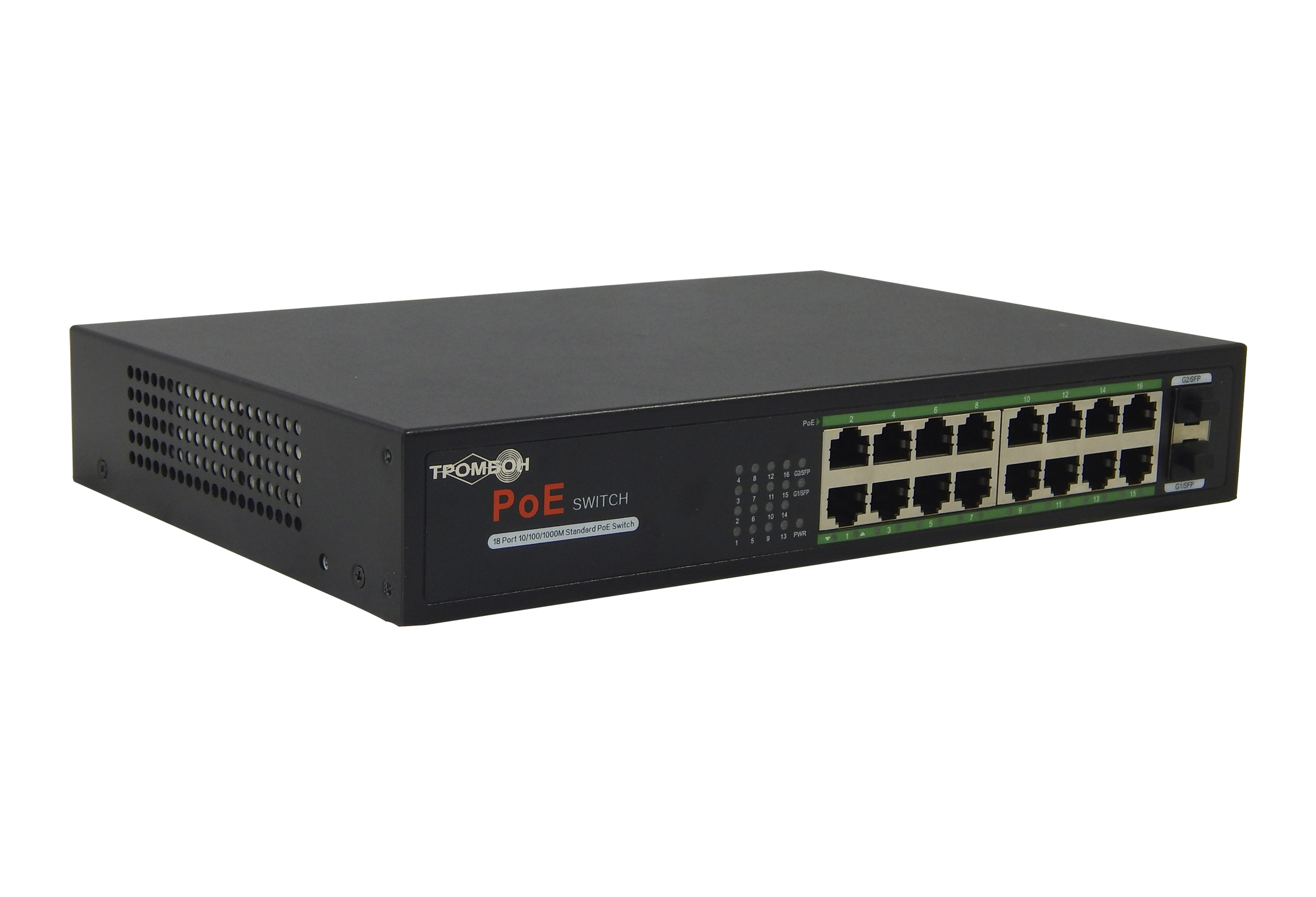 Коммутатор «Тромбон IP-К16» предназначен для коммутации IP-устройств по проводной сети. Коммутатор оснащен 16-ю LAN-портами с поддержкой питания РоЕ-устройств до 30Вт на порт и 2-мя оптическими SFP-портами. Суммарное PoE питание до 200Вт. Исполнение в металлическом корпусе классом защиты IP20 с комплектом крепления в 19" стойку или шкаф. Питание от сети 220В.