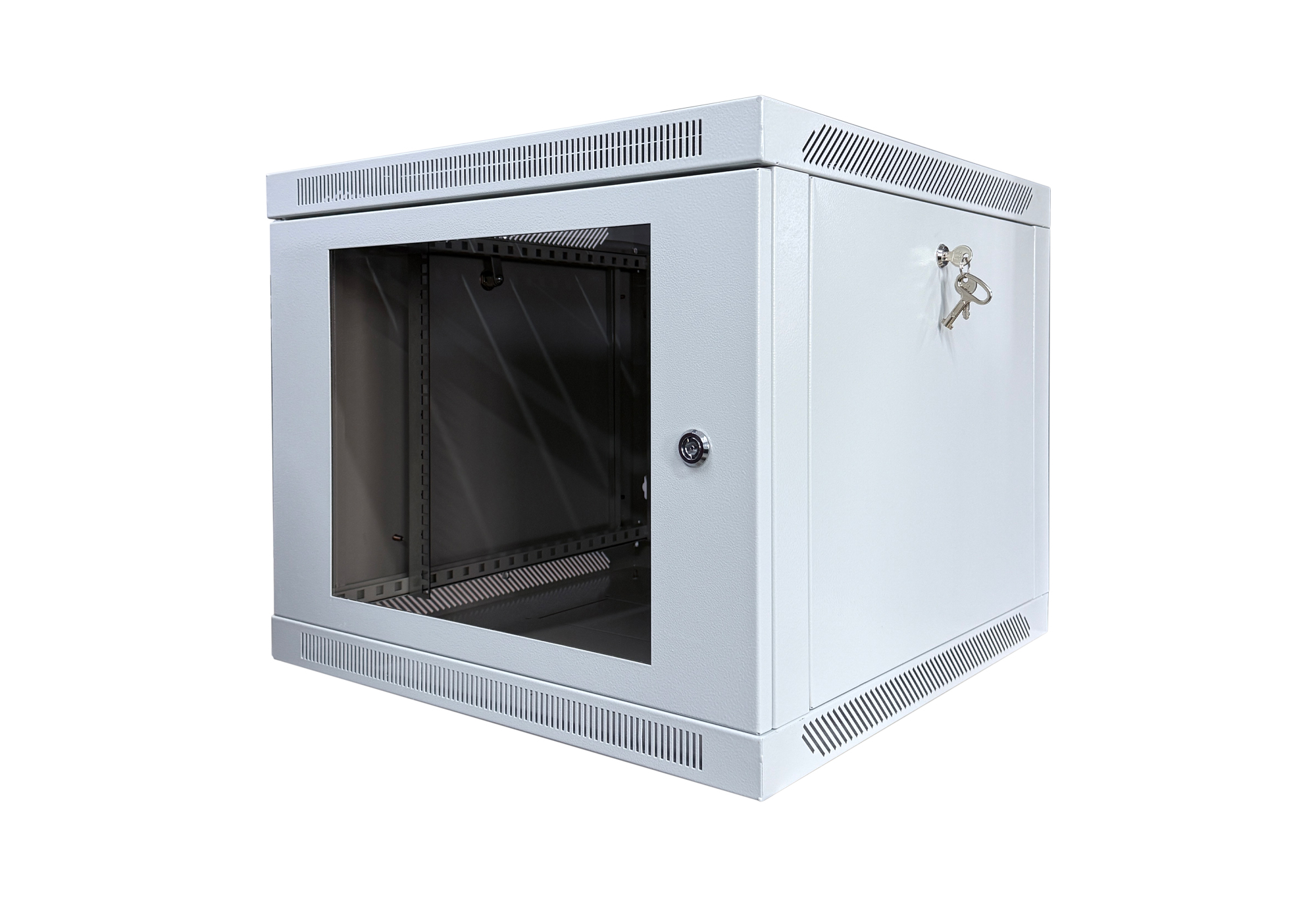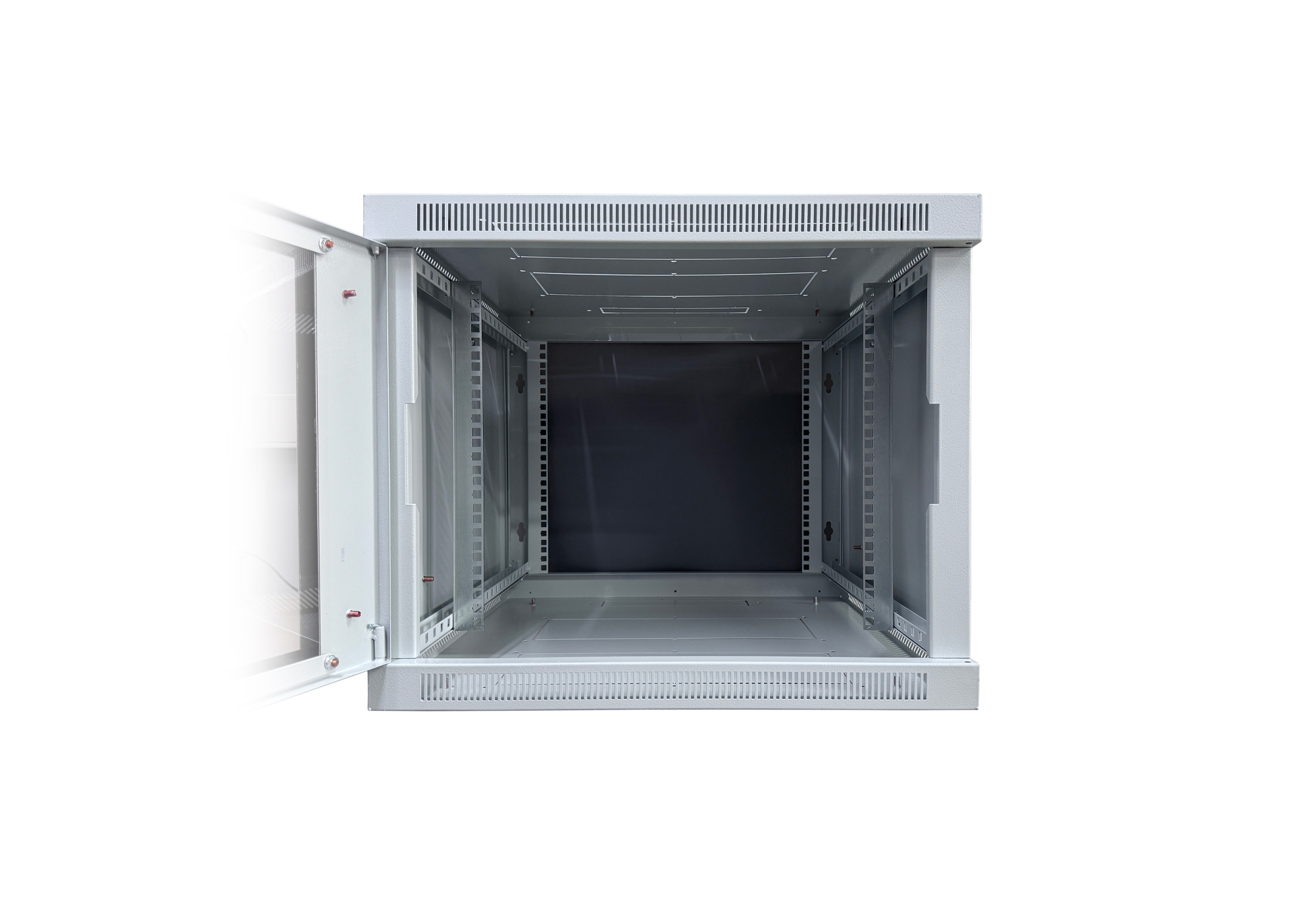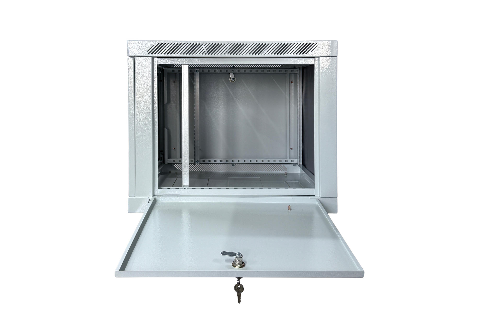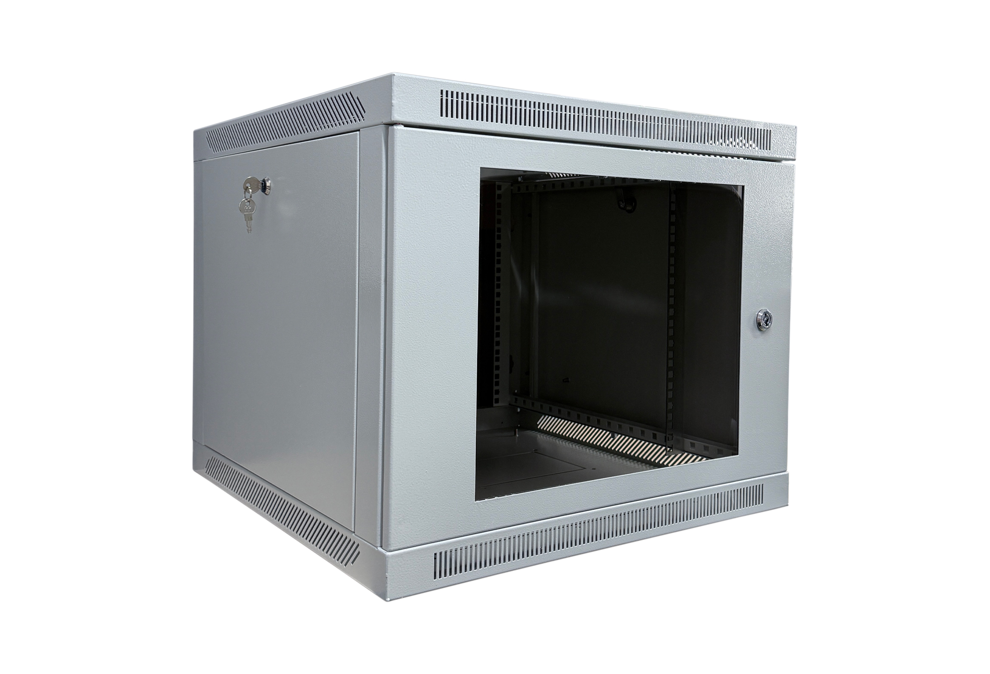 Корпус навесного телекоммуникационного шкафа предназначен для установки в нем 19” модульного коммутационного кроссового оборудования, серверов и источников бесперебойного питания в офисных и промышленных помещения. Конструктив корпуса шкафа представляет собой сборный каркас. Боковые панели съемные, что обеспечивает свободный доступ к оборудованию. Передняя и боковые двери оснащены замками, которые защищают от несанкционированного доступа. Возможна поставка корпуса шкафа с металлической и стеклянной и передней дверью. В крыше корпуса шкафа предусмотрены отверстия для установки вентиляторных блоков для охлаждения рабочего пространства корпуса шкафа. На крыше и основании имеются отверстия для ввода кабелей.