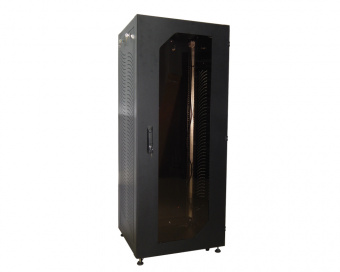 Шкаф телекоммуникационный 19" напольный 47U чёрный на 13 приборов ТШ-476060Ч13 (RAL 9005, 600x600, полезная глубина 506мм, дверь стекло, в комплекте вентиляторный блок с проводом и вилкой 220В, термостат, кронштейн, два блока розеток на 8 гнезд, 13 полок, 13 фальш панелей, ролики, метизы, провода заземления)