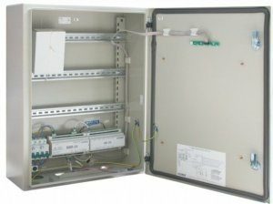 Шкаф для установки приборов системы "Орион" на DIN рейки. Содержит источник питания 12В - 3 А с интерфейсом RS-485. Место для установки двух батарей 12В-17АЧ. Прозрачное окно на двери. Защита оболочки IP40