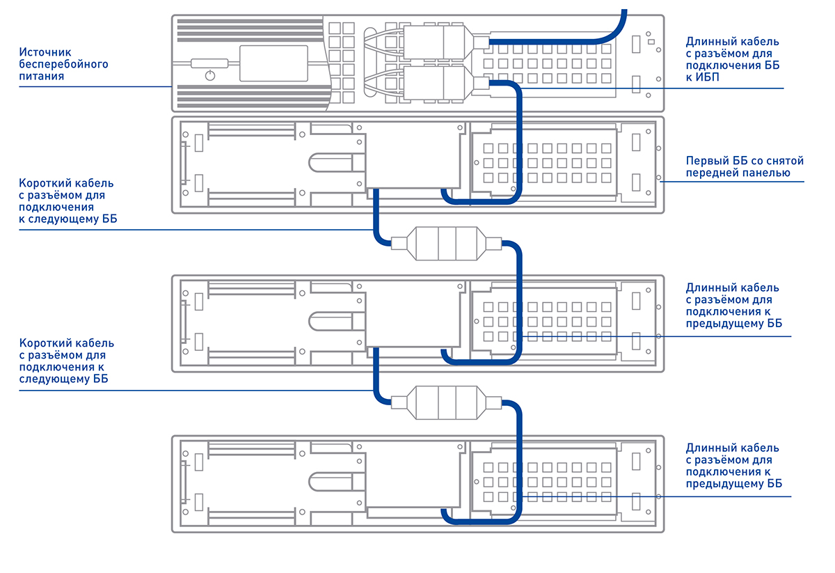 К одному источнику бесперебойного питания (далее по тексту — ИБП) можно подключить от одного до четырех батарейных блоков (далее по тексту — ББ).