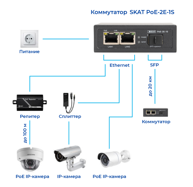 SKAT PoE-2E-1S представляет собой специализированный неуправляемый PoE коммутатор для использования в системах видеонаблюдения и безопасности. Характеризуется высокой надежностью работы благодаря защите от электростатических разрядов и перепадов напряжения, позволяет организовать качественную передачу информации в сети Ethernet.