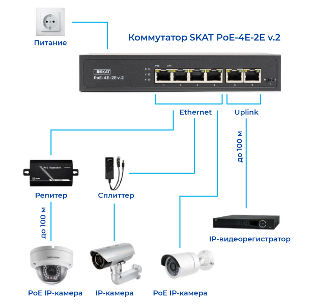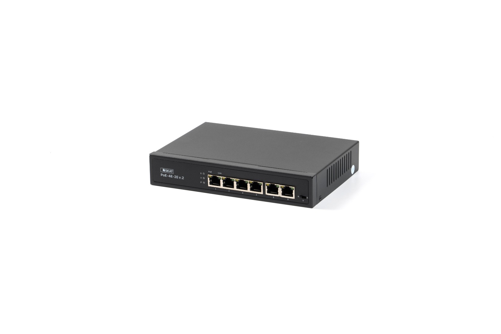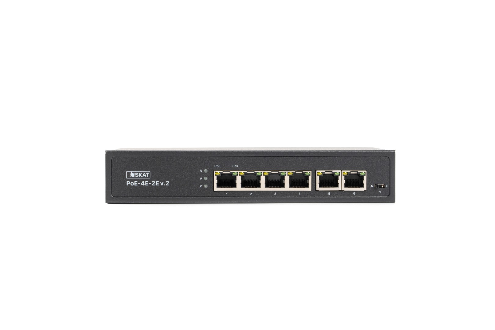 SKAT PoE-4E-2E v.2 представляет собой специализированный неуправляемый PoE коммутатор для использования в системах видеонаблюдения и безопасности. Характеризуется высокой надежностью работы благодаря защите от электростатических разрядов и перепадов напряжения, позволяет организовать качественную передачу информации в сети Ethernet.